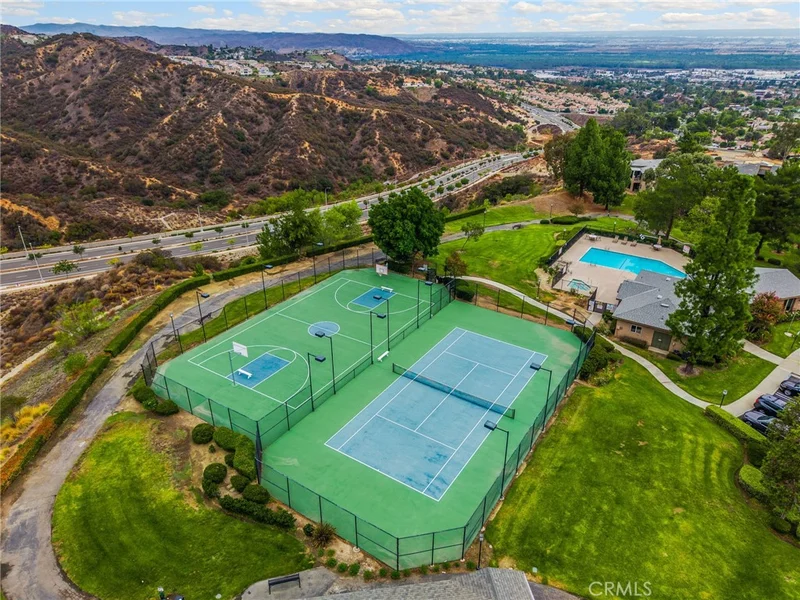 Uncover your dream home in this beautiful, ready to move in, top-floor condo in the gated Crowne Villas community, perfectly nestled above the serene, picturesque hills of Corona near Green River (Ontario and Avenida del Vista). This bright, open-concept one-bedroom, one-bath upstairs unit exudes warmth and charm, featuring a cozy, fireplace, open floorplan, and a stylishly updated bathroom with new fixtures and tile. The open kitchen flows into a breakfast/dining area and connects to a private patio, ideal for relaxing and enjoying breathtaking panoramic views of the lush, mountainous community. Equipped with modern conveniences, the unit includes a dishwasher, stove, microwave, fridge, and stackable washer/dryer. Ample storage enhances everyday living, while the serene, quiet setting is perfect for those seeking peace after a busy day. Community amenities elevate your lifestyle with a clubhouse, sparkling pool, spa, gym, tennis and volleyball courts, a dog park, scenic walking paths, and inviting benches to soak in the stunning hillside views. This upstairs unit in a two-story building offers a carport parking spot and ample open parking for guests. Located close to shopping centers, schools, and parks, this condo offers resort-style living in a tranquil, gated community.