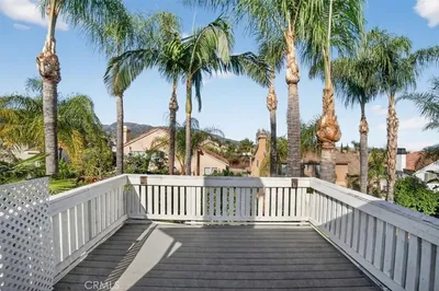 Move in ready 5 bedroom and 3 bath South Corona single family home with three car attached garages and direct access. One bedroom and a full bathroom downstairs. Charming porch area leads to double door entrance. Great open floor plan. Formal living room & formal dining room with vaulted ceiling and crown moldings. Large kitchen with center island, recessed lighting, built-in microwave and eating nook. Kitchen open to family room with fireplace. Spacious master suite with dual sink, separate tub and shower and walk in closet. Large balcony with sitting area off master suite with hills view. Interior laundry hookup area. Whole house repiped by PEX in 2021. Plantation shutters and designer tile flooring in all bathrooms. Large back yard with covered patio, beautiful landscaping and palm trees. Very easy access to 91 FWY and close to schools, park, and shopping.