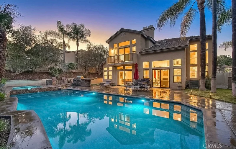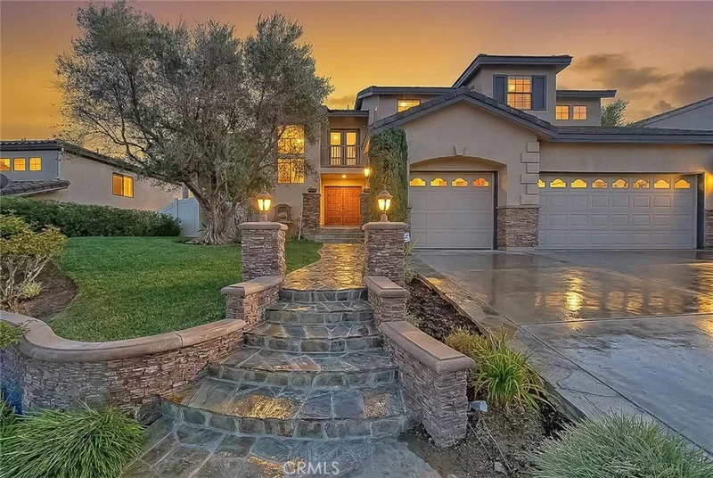 Beautiful, highly upgraded Corona 4 bedroom, 4 bath home with a resort-style backyard featuring a pool, spa, barbecue island, and firepit. The home was built in a terraced fashion, which offers a high degree of privacy from the neighbors. Offering 3,060 square feet of living space on a 10,019 square foot lot (per tax roll), this property impresses inside and out. Front and rear hardscaping includes flagstone decking and stacked rock accents that elevate curb appeal from the moment you arrive. The open floor plan is filled with natural light and finished in a designer color palette. Soaring ceilings welcome you into the formal living room. A dual-sided fireplace connects the formal dining and family rooms, creating warmth for entertaining or relaxing evenings. The well-designed kitchen features furniture-grade wood cabinetry, granite counters, travertine flooring, stainless steel appliances, recessed lighting, a pantry, a center island, a breakfast bar, and a spacious breakfast nook for casual dining. The primary suite is exceptional. A dual-sided fireplace serves both the bedroom and private retreat, ideal for a home office or reading lounge. A balcony off the retreat overlooks the backyard. The en-suite bath offers a dual sink vanity, walk-in shower, soaking tub, and large walk-in closet with built-ins. Upstairs includes two guest bedrooms, each with its own en-suite bath. A main-level bedroom and full bath provide flexibility for guests or multigenerational living. The first floor also features an indoor laundry room with extra storage. The private backyard has no rear neighbor and mature greenery for a serene backdrop. Enjoy the spa year-round, pool in summer, firepit seating area, and stacked rock barbecue island with ample counter space for serving. A large three-car garage and generous driveway parking complete the home. This one delivers on space, upgrades, privacy, and outdoor living. This home is move in ready to enjoy!