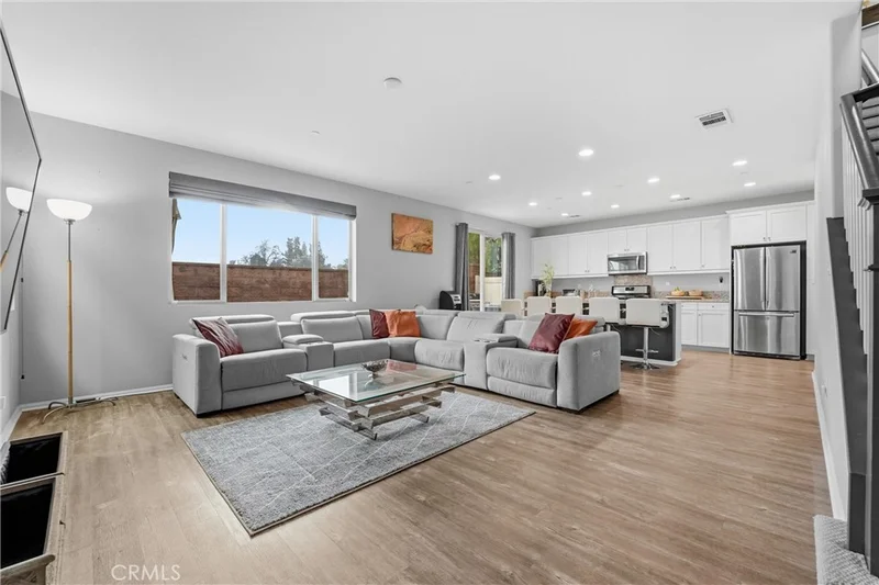 Welcome to Terrassa, an exclusive gated community in the heart of Corona. Built in 2018, this beautifully maintained Plan 2 of Terrassa Court combines modern comfort with timeless Santa Barbara–inspired architecture. As you pass through the private gates, you’re welcomed into an open and airy floor plan featuring 3 bedrooms, 2.5 bathrooms, and approximately 1,807 square feet of thoughtfully designed living space. The main level is bright and inviting, with seamless laminate flooring flowing through the living and dining areas into a kitchen with granite countertops, white raised-panel cabinetry with satin nickel hardware, stainless steel appliances, and a generous center island perfect for gathering family and friends. Custom shades and plantation shutters throughout add style and privacy, while high ceilings enhance the sense of space and openness. Upstairs, the private primary suite boasts plush carpeting, soaring ceilings, and a luxurious en-suite bath with a soaking tub, separate shower, dual vanities, and a large walk-in closet. Two additional bedrooms share a modern hallway bath, and the conveniently located upstairs laundry adds everyday ease. Step outside to a finished, low-maintenance backyard ideal for relaxing or entertaining, while the two-car garage offers direct interior access, additional storage, and a tankless water heater. Energy-efficient features include fully owned and paid solar panels, radiant barrier roofing, enhanced exterior insulation, and an insulated steel garage door. Located near top-rated schools and close to shopping, dining, and entertainment at The Crossings and Dos Lagos, with easy access to the I-15 and toll roads, this home offers style, energy-smart living, and convenient access to everyday amenities.