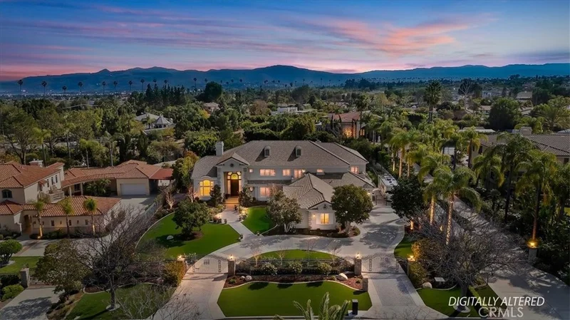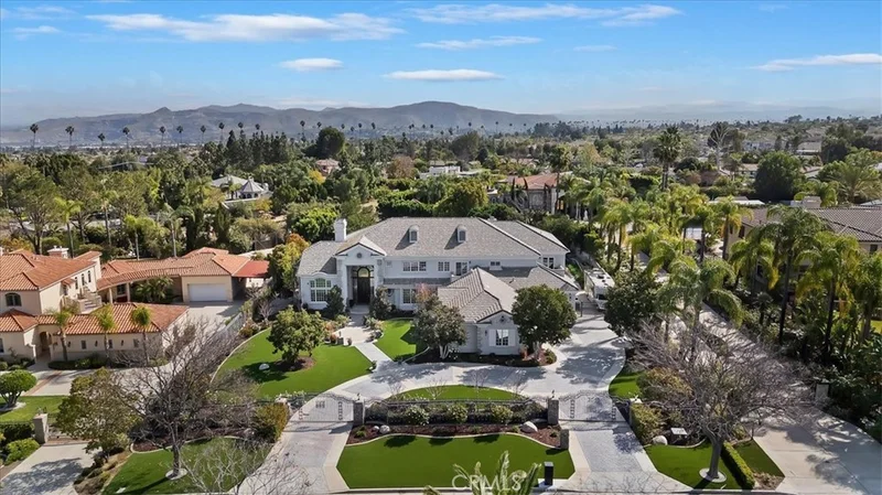 Set behind custom iron gates in an exclusive pocket of South Corona, this exceptional estate blends timeless architecture, privacy, and resort-style amenities. A circular drive welcomes guests to a dramatic entry featuring a 10-foot mahogany door, soaring 24-foot ceilings, crystal chandelier, marble fireplace, and custom mahogany display cabinetry—an unforgettable first impression. Thoughtfully designed by acclaimed Newport Beach architect Dennis Cherry, the home balances elegance with livability. The chef’s kitchen flows seamlessly into the family and billiard rooms and showcases granite countertops, dual Asko dishwashers, Wolf steam ovens, Viking commercial range, Sub-Zero refrigerator, butler’s pantry, walk-in pantry, and wine cellar—perfectly designed for both everyday living and entertaining. The resort-inspired grounds are truly one of a kind. Mature trees and lush landscaping surround a pool with diving board, lighted pickleball court, batting cage, and an impressive golf practice facility featuring a green, bunker, and 30+ yard pitching area. Covered outdoor living spaces, a barbecue area, and zoned speakers create the ideal setting for gatherings or quiet relaxation. Additional highlights include a library, den with surround sound, private guest/in-law suite with separate entrance, oversized laundry room with dual washers and dryers, and an upstairs activity room with built-in workstations and balcony access. The luxurious primary suite offers a peaceful retreat with sitting area, spa-style bath with jetted tub, dual-head shower, and expansive walk-in closet. Car enthusiasts and hobbyists will appreciate the 5-car garage with EV charging, workbench area, storage lockers, central vacuum, and additional attic storage, along with paved motorhome parking with power. Built with quality and efficiency in mind, the home also features three HVAC systems, whole-house fans, dual security systems, recirculating hot water, and extensive storage throughout. A rare offering combining privacy, recreation, and refined living—delivering a true luxury lifestyle in the heart of Corona.