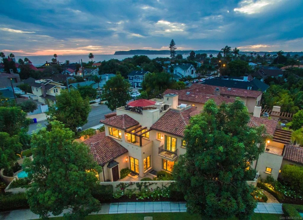 Step into your private sanctuary at this extraordinary compound, perfectly positioned on a rare corner lot in the heart of Coronado. Just one block from Center Beach and the iconic Hotel Del Coronado, this distinguished residence is a true architectural showpiece—designed by Dorothy Howard and constructed by Papenhausen Construction—where timeless elegance meets exceptional craftsmanship. Exuding classic Mediterranean charm, the home is richly appointed with an exquisite blend of natural stones, marbles, and granites. The interiors are grand yet inviting, featuring soaring vaulted ceilings with vintage timber beams, custom cabinetry, and crystal chandeliers that lend warmth and sophistication to every space. Encompassing approximately 5,400 square feet, this one-of-a-kind property offers a thoughtfully designed floor plan ideal for both relaxed living and entertaining. The primary suite serves as a luxurious retreat with a spa-style bathroom, complemented by three additional en-suite bedrooms. The expansive great room is perfect for family gatherings, while the custom-paneled executive office, temperature-controlled wine cellar, private theater, and serene outdoor spa create a resort-like experience at home. The professionally landscaped yard provides a tranquil garden setting for relaxation or entertaining. Rooftop deck offers sweeping views and the ideal backdrop for sunset cocktails or evening BBQs. Modern features including an elevator, Lutron lighting system, central vacuum, storage room, and a three-car garage ensure comfort and convenience at every turn. This exceptional home is ideally located for those seeking both privacy and proximity—just steps from the beach, restaurants, shops, and the vibrant lifestyle of Coronado Village. A rare opportunity to own a legacy property in one of California’s most prestigious coastal communities.