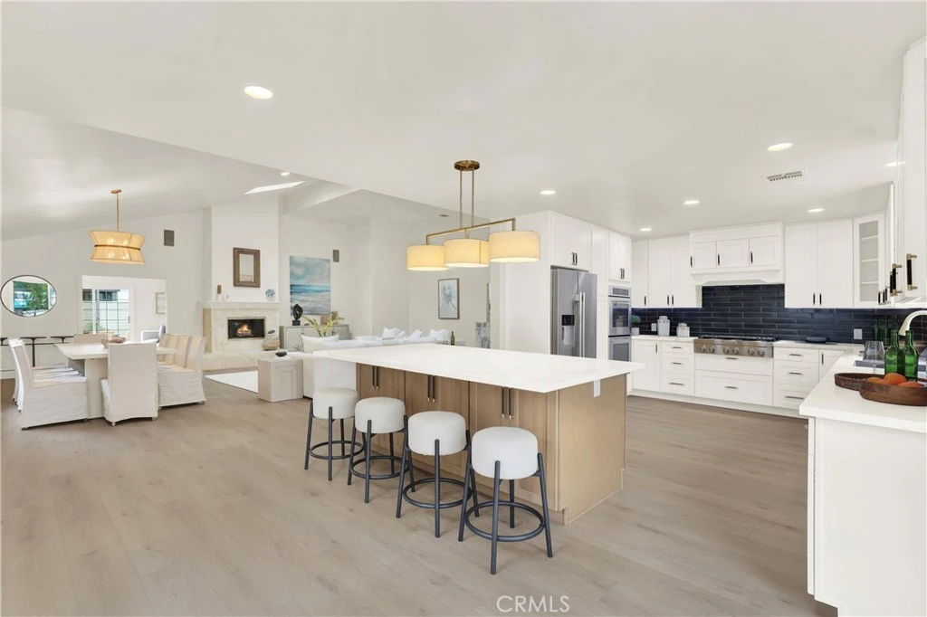 Spectacular single-level updated home of over 3,000 square feet nestled on a cul-de-sac in the highly desirable area of Eastside Costa Mesa. Located near Newport Back Bay, this jewel with a lot size of nearly 8,300 square feet exudes the beach vibe with sophisticated coastal charm. As you enter the foyer, meander into the enormous living room with vaulted high ceilings, skylights for optimum light, inviting fireplace, adjacent dining space, and an attractive open floor plan which leads you into the stunning remodeled Island Kitchen with new custom Asheville Cotton white oak cabinets, new stainless steel appliances, new luxury plank flooring, new recessed lighting, dazzling large island bar with Whiskey Royale white oak cabinets, built-in wine cooler, food pantry, new premium sink and faucet, and gorgeous brass cabinet door handles with brown leather inlays. This impressive home has new luxury plank flooring and baseboards throughout, new interior paint throughout, new exterior paint throughout, new lighting, owned solar panels, and much more. Adjacent to the living room, is a room with many options including a family room, den, or office with direct access to the backyard. As you transition to the 3 bedrooms, you will exit stage left to the spacious primary suite with large walk-in closet, high ceilings, luxurious bathroom with new travertine tile, new quartz countertops, new faucets and lighting, new seamless glass shower, and a relaxing soaking tub. As you stroll over to the middle bedroom you will be greeted with a staircase up to a loft ideal for a children's play area with this room having plenty of storage for all your goodies. Adjacent to the middle bedroom you will find a delightful bathroom with high ceilings, skylight, and new light fixture & faucet. The third bedroom is a suite featuring a walk-in closet, remodeled bathroom with new travertine flooring, quartz countertops, seamless glass shower with fancy ceramic tile and vanity. Make your way out to the newly landscaped backyard ideal for entertaining family and friends with a spacious patio area, custom fire pit table, deluxe barbecue with additional gas stove top and refrigerator, avocado and peach tree, and new hedge trees for privacy. Take advantage of this opportunity to own your slice of coastal heaven close to Newport Beach, Newport Harbor, Hoag Hospital, Fashion Island, John Wayne Airport, Fine Dining, Luxury Shopping, and much more. It's time to make this your dream home!