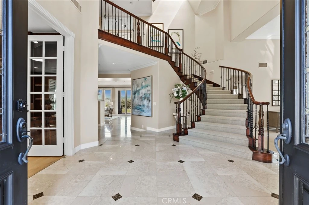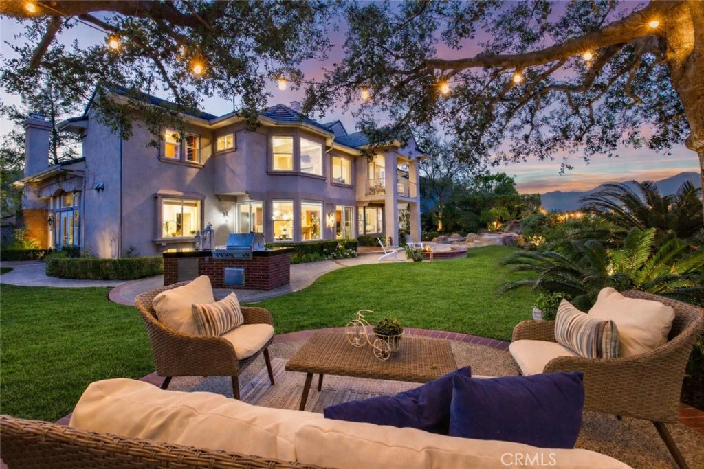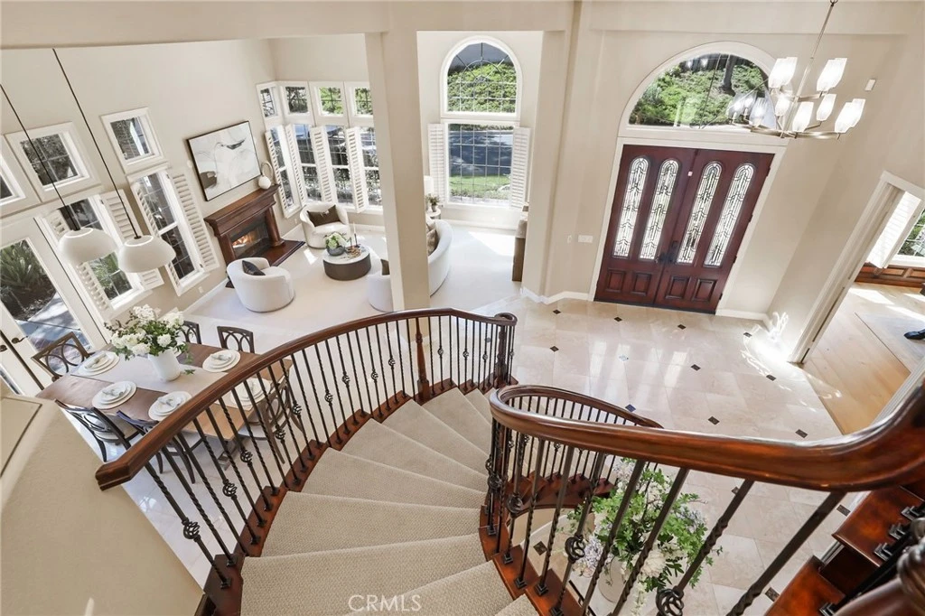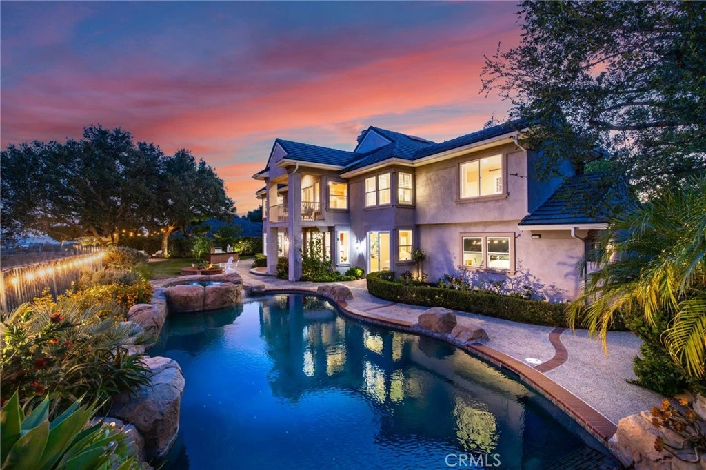 A panoramic masterpiece positioned near the highest elevations of the prestigious guard-gated community of Coto de Caza. Located toward the end of a quiet single-loaded street, this home offers exceptional privacy along with sweeping views of the golf course, rolling hills, and surrounding mountains. Recent improvements include a brand new roof, oakwood-color engineered flooring throughout both levels, a new pool pump, and fresh interior paint, creating a bright, cohesive, and updated interior. Interior features include rich wood detailing, plantation shutters, and stone flooring. The home is also equipped with a whole house water filtration system and soft water system. Spanning approximately 5,000 square feet on an expansive 0.45-acre lot, this home offers 6 bedrooms, 5 bathrooms, plus a dedicated office, thoughtfully designed for both functionality and comfort. Enter through double doors into a grand foyer with soaring ceilings and a skylight that fills the space with natural light. The living and dining areas are seamlessly connected, while expansive windows frame lush greenery and scenic views. The main level includes a private executive office with built-ins and a guest suite with ensuite bath, ideally positioned with views of the backyard garden, pool, and mountains, along with convenient access to the outdoor space. The chef’s gourmet kitchen is equipped with stainless steel appliances, a 6-burner Viking Professional gas range, microwave, warming oven, center island, beverage refrigerator, and abundant cabinetry. A walk-in pantry has been converted into a wine storage area with custom wooden racks and a wrought iron door. Upstairs, the expansive primary suite offers panoramic views of the Coto de Caza Valley, a double-sided fireplace, and a spa-inspired bathroom with dual vanities, vanity area, and a large walk-in closet. Four additional bedrooms provide flexibility for guest rooms, bonus room, gym, or office. Step outside into an entertainer’s dream backyard featuring a pool and spa, BBQ island with counter seating, fire pit, lawn area, and multiple patio spaces. Surrounded by blooming flowers and mature landscaping, the garden creates a peaceful setting with unobstructed mountain and valley views. Offering a rare blend of space, privacy, and breathtaking views, this home presents an exceptional opportunity to experience the finest of Coto de Caza living.