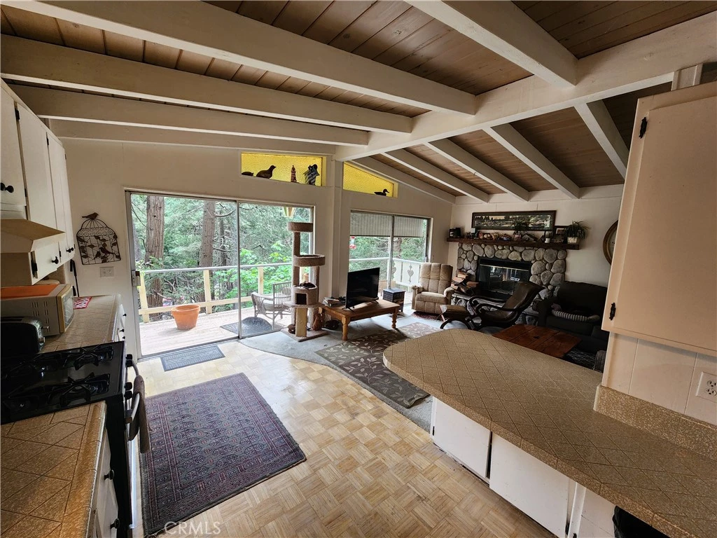 Charming mountain fixer home with great upside potential! Features an oversized garage and tons of parking! Great open floorplan with open beamed ceilings, cozy rock fireplace and generous wall of windows facing out to a lush forested setting. Nice sense of privacy and feeling of being in the woods/forest. Home is somewhat split level with kitchen living room bathroom area and then stairs up to two bedrooms plus a tiny kids sleeping loft. Owner prefers cash or hard money offers and no repairs will be made by the owner. Home is in need of lots of TLC and won't go FHA/VA or Conventional financing.