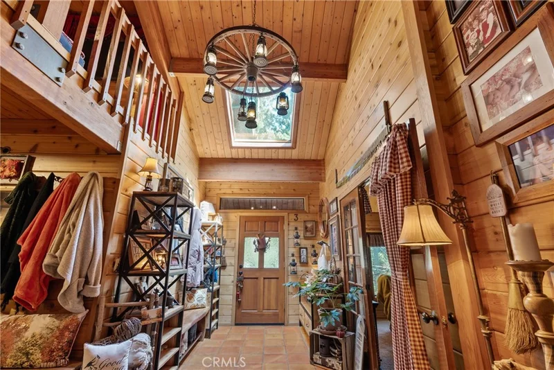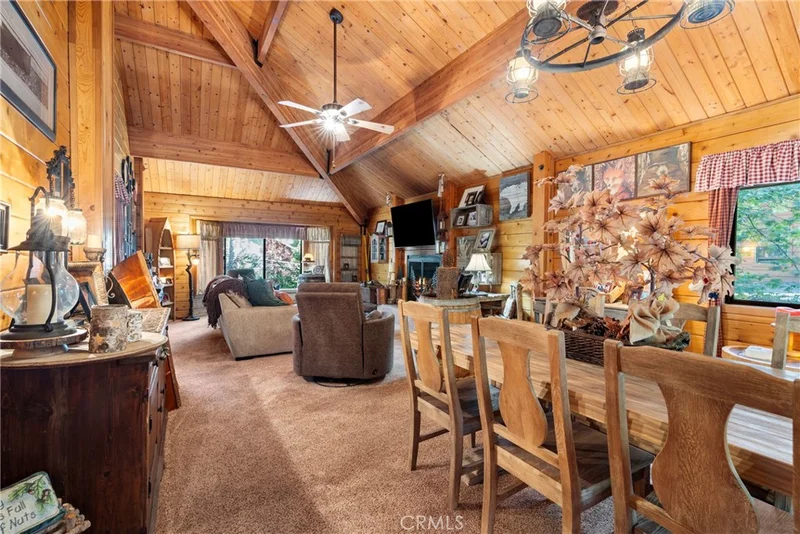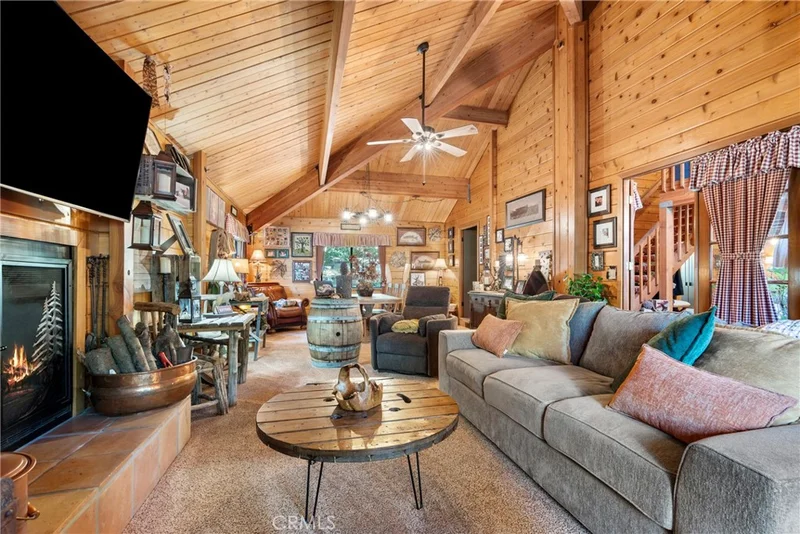 Magnificent Rustic 4+ Bedrooms with 3 Baths on a FLAT over 18,000 sq ft lot. Oversized two car garage with separate workshop space. Concrete driveway with parking for 10+ cars or an RV and Boat and still room for several cars. Backs up to the over 200 acres of the Thousand Pines Camp. Grand entrance Hall into this mansion like home that has quality wood paneling inside and out. Vaulted open beamed ceilings. Unique design touches throughout the house. Huge Living Room/Dining area on the left w/wood burning fireplace. Just down the hall, a recently remodeled large kitchen with a restored antique stove, double door side by side refrigerator and center island. Kitchen is open to large Family Room with wood burning stove and an exit out to a large concrete patio and a forest of trees. Den on main floor converted into an additional Bedroom making 5 with adjoining custom designed Bath. Separate laundry room. Upstairs is a small sitting area and double doors opening into a huge Master Bedroom and Bath with spa tub. 2 closets w/one a walk in. 3 more Bedrooms and a Bath down the hall. Ceiling Fans in nearly every room. Dual pane windows. Newer upper/lower zoned forced air heating system. Roof 10 years old. Newer water heater. Separate storage and wood sheds. Located in the exclusive Mile High Park area of Crestline.