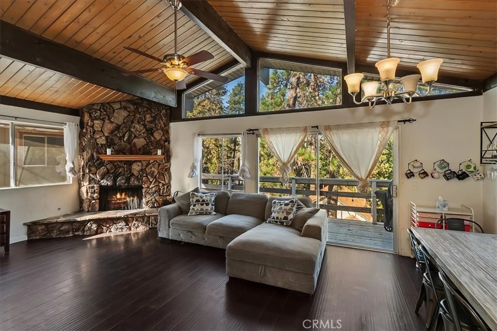 Welcome home to this cozy and inviting level-entry mountain retreat, perfectly suited for everyday living or a peaceful weekend escape. Just a short walk to the local elementary school, this home offers a rare blend of comfort, convenience, and mountain charm. The light-filled great room is a true gathering space, featuring open-beamed ceilings, a wood-burning stone fireplace, and floor-to-ceiling windows that bring the outdoors in. Step out onto the spacious upper deck—an ideal spot for morning coffee, evening relaxation, or entertaining friends. The open-concept living, dining, and kitchen area makes hosting easy and enjoyable. The updated kitchen includes granite countertops, sleek cabinetry, and stainless steel appliances, including a newer refrigerator and dishwasher. Durable vinyl flooring, recessed lighting, and a mini-split system for efficient year-round cooling add everyday comfort and ease. On the main level, you’ll find a comfortable bedroom and full bathroom, making the level entry layout both practical and accessible. Downstairs, the home opens up even more with a large family room that’s perfect as a playroom, media space, or second living area, complete with access to an additional deck and the backyard. Two more bedrooms and a bathroom with a walk-in shower make this level ideal for guests or a private retreat. Outside, enjoy off-street parking for up to four vehicles and a 10x10 Tuff Shed for extra storage. Whether you’re looking for a full-time home close to school, a mountain getaway with room to spread out, or a place designed for both relaxing and gathering, this home truly has it all.