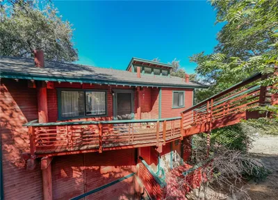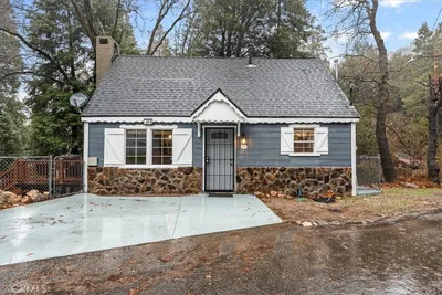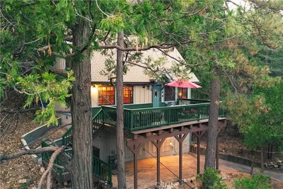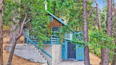Stunning 2BR/1.5BA mid-century modern cabin on Lake Gregory's northeast shore with breathtaking panoramic lake and mountain views. This architecturally unique property blends classic cabin charm with sophisticated mid-century interior design, featuring dramatic exposed beam ceilings and walls of windows framing spectacular scenery. The open-concept interior showcases a modern galley kitchen with stainless steel appliances flowing seamlessly into dining and living areas under soaring beam ceilings - perfect for entertaining while enjoying incredible lake vistas. Two private patios offer ideal spaces for morning coffee or sunset cocktails overlooking the serene lake. Meticulously maintained over the years, the property includes above-grade parking for two vehicles plus additional street parking. A rare opportunity to own Lake Gregory's northeast shoreline - the perfect retreat combining tranquil lakefront living with distinctive architectural character. Whether as a primary residence, vacation getaway, or investment property, this cabin offers an unmatched lifestyle in one of the area's most coveted locations. Don't miss your chance to own lakefront paradise with views that never get old.
