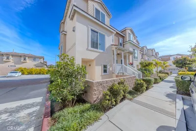 Former end unit Melia homes private model home with all the upgrades and finishes. Enter through the private entertainers ground level patio adjacent to the community pool for convenience. The gourmet kitchen is open to the family room with a built-in breakfast nook and walk-in pantry closet. shower. The entry level also includes an attached two-car garage with an universal car charger, tankless water heater. The upstairs features an open, bright entertainment loft, two guest bedrooms, laundry room, and the primary master suite. Additional upgrades include custom window coverings, LED recessed, lighting throughout, a whole-house fan, and a programmable Wi-Fi smart thermostat, front door lock. Community amenities including a pool, spa, BBQs, and picnic area. This home is conveniently located near Costco, Trader Joe's, and in a coveted school district. Photos were professionally taken with model home furniture.