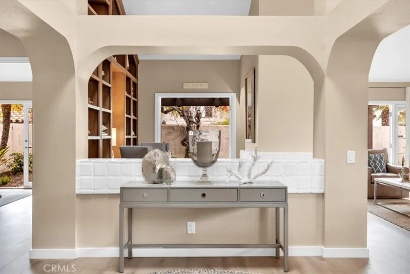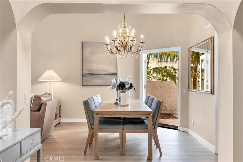 Tucked away in the Villas of Niguel Shores, this tranquil coastal hideaway offers the perfect blend of luxury and serenity. Enter through a charming wrought iron gate into a lush, private courtyard adorned with tropical landscaping and a brick patio. At its heart, a clover-shaped spool with a pergola offering shaded seating, ideal for relaxing or entertaining.A grand wooden door opens into a spacious foyer with blonde wood floors and cathedral ceilings with a skylight flooding the entry with natural light. To the right, a gourmet kitchen boasts granite countertops, built-in refrigerator, dishwasher, oven, and a generous island with electric cooktop and storage. French doors connect the kitchen to the courtyard and spool—perfect for indoor-outdoor living.Through a pocket door, is the formal dining room featuring a chandelier and French doors opening to a secluded side yard. Adjacent, the elegant living room centers around a sleek gas fireplace with white tile surround creating a warm and relaxing gathering space. French doors open to the back patio, where tropical landscaping, covered deck, and a gas fire pit enhance the coastal ambiance.A partial wall divides the living room from a cozy inglenook with a two-sided fireplace, built-in chestnut shelving. There are additional french doors in the nook to the outdoors, inviting in the ocean breeze.Down the hall, the secondary bedroom includes mirrored closet doors, private entry from the courtyard, and continuous blonde wood flooring. The adjacent guest bath features a tub/shower combo, long counter, and dedicated vanity space.At the end of the hall, the primary suite impresses with a dramatic mirrored accent wall and French doors to the patio. A sliding barn door reveals the ensuite bath with dual sinks, vanity area, and three mirrored closets. A separate door leads to a large soaking tub/shower.Situated on a desirable corner lot, this home enjoys the resort-style amenities of Niguel Shores, including a private ocean bluff with beach access, pickleball and tennis courts, bocce ball, pool and spa, playgrounds, and clubhouse.Steps outside the community are two 5 star resorts within walking distance, Salt Creek Beach, and Downtown Dana Point and Harbor.