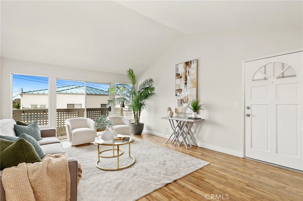 Perched on the top floor in the desirable Harbor Walk community, this beautifully upgraded 1-bedroom, 1-bath residence offers approximately 700 square feet of light-filled living space with a fresh, modern feel throughout. Soaring cathedral ceilings enhance the open layout, while fresh interior paint and updated flooring create a clean, move-in-ready environment. The inviting living room flows seamlessly into a charming dining area and extends to a full-length private balcony —perfect for relaxing or entertaining. The remodeled kitchen is a standout feature, showcasing rich quartz countertops, white cabinetry, and ample workspace for both everyday living and hosting. The serene primary suite features vaulted ceilings, a spacious closet, and a well-appointed en-suite bathroom with quartz surfaces and a mirrored vanity. Additional highlights include an assigned parking spot and guest parking along with access to the community pool. Ideally located just about a mile from the beach, with quick access to the 5 Freeway and surrounded by an abundance of shopping and dining options, this home offers an exceptional blend of comfort, style, and coastal convenience.