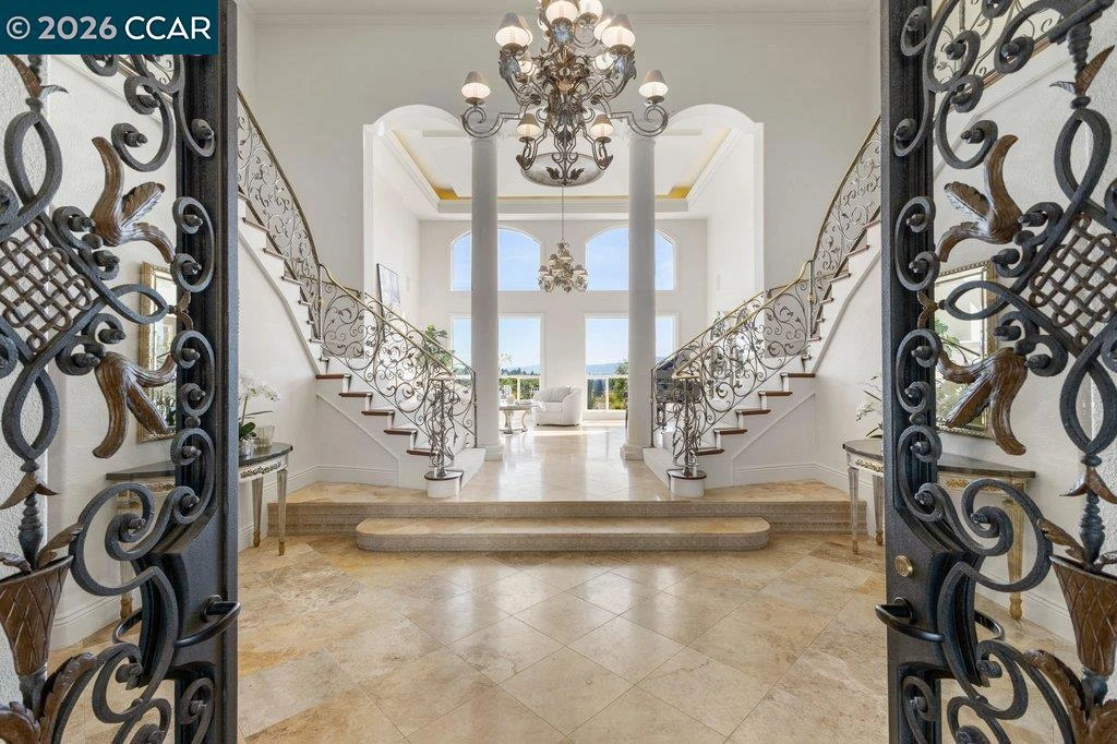 A secluded drive ascends to the hilltop gated estate, Bella Vista de Valle, a Mediterranean masterpiece defined by effortless living, exceptional lifestyle, and quiet luxury. Sweeping 360-degree views, highlighted by Mount Diablo, are perfectly positioned as though the landscape were a work of art framed exclusively for this remarkable residence. A grand foyer impresses with soaring 19-foot ceilings, stately columns, and picturesque windows that frame breathtaking valley vistas. Set on approximately 5.31 acres and spanning 13,410± square feet, the estate offers 7 bedrooms, 7 full baths, and two half baths, along with expansive living spaces and a newly renovated gourmet kitchen. Dual Calcutta Supreme islands anchor the space beneath designer chandeliers, complemented by custom fluted-glass cabinetry, ambient lighting, and a full suite of professional-grade appliances with an adjacent hidden pantry that reveals itself like a well-kept secret. Exceptional amenities include an INDOOR BASKETBALL court, au pair suite, exercise room, billiard/bonus room, richly detailed office, & more. The resort-style grounds showcase a spectacular pool, spa, fire pit, bocci court, putting & chipping greens, a soccer field, a children’s playground, an outdoor kitchen, & multiple covered loggias.