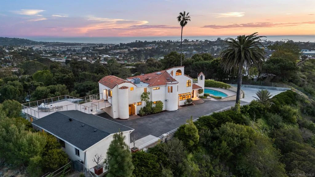 Perched on a coastal hilltop with panoramic sunset ocean views, this Santa Barbara-style home is in a league of its own. Situated on over an acre and drenched with natural light, this thoughtfully designed residence re-invents what it is to live in Solana Beach. The home offers 4 bedrooms + an office—all with water views—3 full bathrooms, and a detached 1-bedroom, 1-bathroom guest house. The stylish kitchen features all-new cabinetry, custom joined butcher block and hand-poured epoxy countertops fitted with stainless appliances and walk-in pantry. Both levels of the home have been upgraded with new LVP flooring, carpet, and baseboards, and newly renovated bathrooms. The stunning downstairs living room features dramatic vaulted wood-paneled ceilings, endless views of the Del Mar Racetrack and Pacific Ocean, complete with a custom wet bar and wine fridge. The entire property is sustainably powered by 81 owned solar panels, features citrus trees an avocado tree and chicken coupe. Making it a rare offering that combines luxury coastal living with privacy, space, and estate-like amenities. Extras include a detached 3-car garage, expansive view deck off the primary bedroom, swimming pool, multiple skylights, storybook lookout tower, and a 1,500sqft detached steel workshop/garage. An ultimate space for car enthusiasts, woodworking, storage, or a spacious office plus ample parking accommodates RV, boats, and additional vehicles. Ideally situated near world-renowned beaches, prestigious golf courses, the iconic Del Mar Racetrack, and offering quick access to freeways and shopping.