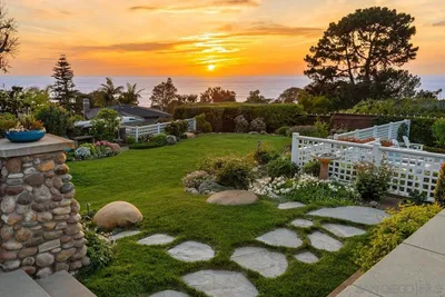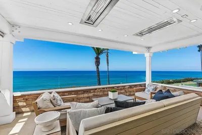 Hidden from the street in Olde Del Mar, this 5,441 sq ft coastal retreat blends privacy, design, and effortless indoor-outdoor living. Set on a rare site, it captures panoramic ocean views, Torrey Pines, and open sky. A bridge over the infinity pool leads to the main entry, where natural light fills the open interiors. Disappearing glass walls connect the living spaces to the landscape, perfect for entertaining or quiet retreat. The chef’s kitchen features walnut cabinetry, Wolf 8 burner gas range with double oven, Sub Zero Professional fridge/freezer, dual Miele dishwashers, built-in Miele coffee machine, reverse osmosis filtration, hidden pantry, and a floating prep island with waterfall marble dining table. The main level primary suite opens to a private ocean-view deck and spa-inspired bath with steam shower and heated floors, steps from the pool and jacuzzi. Four additional en suite bedrooms, including one on the main level, provide comfort and privacy. A lower-level media/game room with kitchenette sits beneath a pool ceiling, shimmering with natural light from skylights. A detached gym with dedicated HVAC offers an ideal private wellness or studio space, while the garage is equipped with an EV charger. A semi-private trail leads to the beach, minutes from Del Mar Village, dining, coffee shops, hiking, Dog Beach, the Racetrack, and I-5 access.
