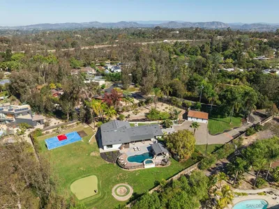 This architecturally significant residence is positioned on over an acre of elevated, exceptionally private grounds in Del Mar, surrounded by mature landscape and natural beauty. Inside, a dramatic two-story living room framed by walls of glass and skylights captures expansive valley and hillside views, establishing an immediate connection between interior and exterior spaces. The floor plan unfolds with intention, enabling a natural flow between living areas that feel both open and grounded. The living experience spans multiple levels, each offering a distinct sense of space and perspective. The entry-level primary suite provides a quiet retreat with direct access to the outdoors. Below, three bedrooms and a secondary living area, anchored by a striking wine display, allow flexibility for guests, entertaining, or everyday living. At the top, a sculptural staircase leads to a private office with bath and access to a view deck overlooking the polo fields, easily adaptable as a fifth bedroom or creative workspace. Outside, the property transforms into a true retreat. A curved pool and spa anchor the grounds, surrounded by multiple lounge areas, an outdoor kitchen, and layered greenery that provide both privacy and atmosphere. From sunlit terraces to shaded gathering spaces, the setting is designed for both quiet moments and effortless entertaining. A home that lives like a private resort, where architecture, landscape, and light come together to create rare scale, privacy, and a sense of escape in one of Del Mar’s most sought-after rural settings.