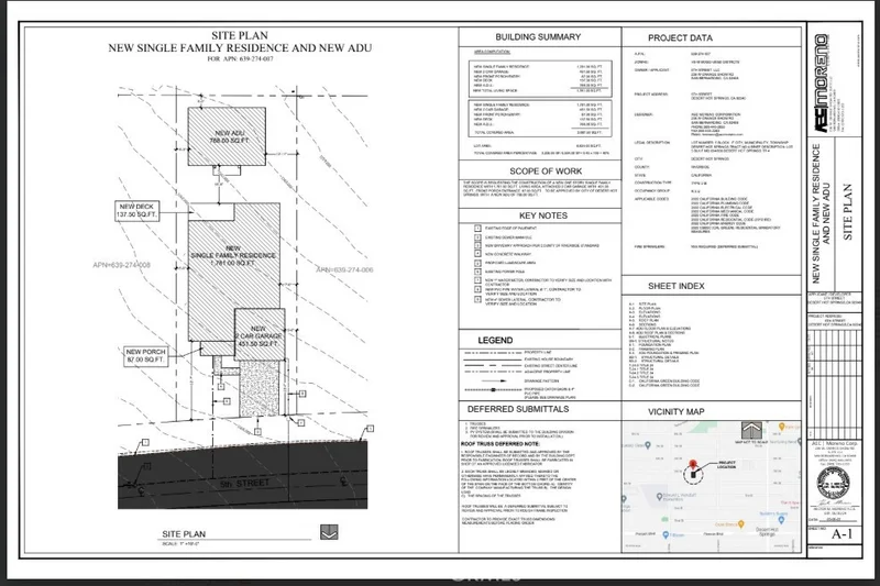 New construction opportunity in Desert Hot Springs! This planned home will offer approximately 1,781 sq. ft. of living space with a well-designed floor plan. Plans are complete and ready for submission to the city, providing a great opportunity for a buyer or investor to move the project forward. The main home will feature a spacious master bedroom with a walk-in closet and private master bathroom, plus two additional bedrooms and one full bathroom. The layout includes a family room, a kitchen with a pantry closet, and a dedicated laundry room. A two-car garage provides convenient parking and additional storage. Additional features include a new front porch entry, a new deck, and a detached 768 sq. ft. ADU in the backyard, offering excellent potential for rental income, guest quarters, or extended family living. Located on a vacant lot in the growing city of Desert Hot Springs, this is a great opportunity to build and own a brand-new property in the Coachella Valley.