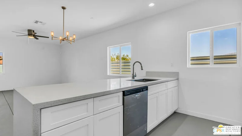 New Construction Dual-Residence Desert Retreat with Owned Solar! Discover modern desert living in this corner-lot home featuring a full detached guest casita (ADU) perfect for multi-generational living or rental income. This property offers versatility, efficiency, and comfort. The main home boasts an open-concept design with a bright, airy living room, a chef's kitchen with granite counters, breakfast bar, and stainless appliances, plus 3 spacious bedrooms and 2 full baths. The separate casita offers its own kitchen, living area, 2 bedrooms, 1 bath, laundry, and even its own garage ideal for guests, extended family, or an income-producing rental. Additional features include owned solar panels, central HVAC, and parking for multiple vehicles. Located just minutes from Palm Springs, shopping, dining, and renowned hot springs spas, this home blends modern convenience with desert charm. Whether you're seeking a primary home, vacation getaway, or investment this is the home for you.