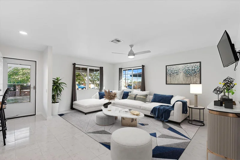 Welcome to this stylish contemporary home situated in the heart of Desert Hot Springs. This exquisite 3BR, 2BA residence unfolds over 1,602 sq ft, exuding contemporary elegance and craftsmanship. The home greets you with recently renovated flooring and seamlessly smooth, matte walls, setting a backdrop of understated luxury. The expansive chef's kitchen presents modern counters and sleek cabinets, perfectly complemented by upscale appliances and new light fixtures that provide ambient illumination throughout. BRAND NEW ROOF and dedicated laundry room too!The 500 sq ft en-suite is a sanctuary of relaxation, featuring a new mini-split for personalized comfort. A new electrical sub-panel prepares the home for seamless solar integration, reflecting the property's forward-thinking design ethos. Outdoors, the large lot offers serenity and privacy, framed by a sturdy block wall and adorned with custom metal gates that blend art with function.Positioned conveniently close to the post office and shopping, this home harmonizes everyday convenience with refined living. Immerse yourself in this luxurious retreat and experience the pinnacle of desert living. Ideal for those who appreciate meticulous attention to detail, this property redefines contemporary elegance in a vibrant desert setting.