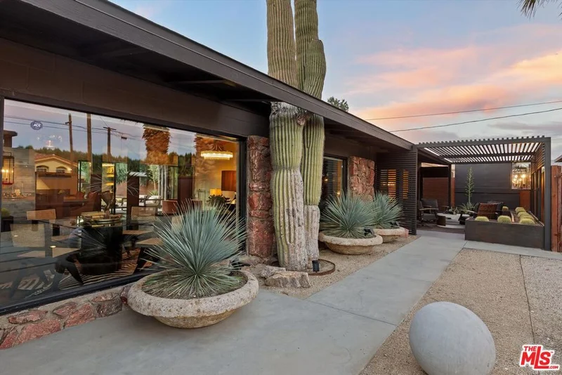 A secluded desert retreat where architecture, landscape and light move in quiet harmony. Set behind a private gate, this extensively remodeled mid-century residence offers a rare balance of refined design, intentional layout and effortless indoor-outdoor living, framed by open skies and mountain silhouettes. At the heart of the home is an expansive great room where the kitchen, living and dining areas unfold as one continuous, light-filled space. Clean modern lines, exposed original wood beam ceilings and curated textures create a sense of grounded luxury, while expansive glass sliders stretch along the perimeter, dissolving the boundary between inside and out. The kitchen anchors the space both visually and functionally, featuring sleek custom cabinetry, integrated appliances, open shelving and a dramatic central island designed for gathering, cooking and conversation. The primary suite occupies its own private wing, offering a serene retreat with generous proportions, direct outdoor access and a spa-like bath complete with dual vanities and a glass-enclosed shower. A spacious walk-through closet and private patio enhance the sense of retreat and separation from the rest of the home. On the opposite side, three additional bedrooms with private patios and two spa-like baths are thoughtfully arranged, creating a comfortable guest or family wing. Outside, the property truly comes alive with a resort-style pool surrounded by sculptural desert landscaping and multiple lounging zones designed for slow mornings and golden-hour evenings. The seamless connection between the interior and outdoor spaces allows the home to live as beautifully outside as it does within. Located just 10 minutes from Palm Springs, this stunning property was created for those who value intentional living, privacy and timeless desert style - a place where modern design meets the restorative rhythm of the desert.
