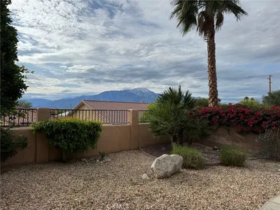 Welcome to this wonderful single-family home located in a gated senior community near the Mission Lakes Country Club. This beautifully maintained two-bedroom, two-bath residence is the perfect desert getaway or a comfortable place to call home. Primary bedroom offers large slider that leads to the backyard, walk in closet, and a primary bathroom with dual vanity. The home features new Tesla solar panels with energy battery storage and power wall, custom window coverings, gas fireplace, wireless ADT security system with remote and a New tankless water heater, making it both energy-efficient and cost-effective. Enjoy stunning mountain views from the backyard, complemented by low-maintenance desert landscaping with mature fruit trees and the privacy of a gated neighborhood. Residents enjoy access to outstanding HOA amenities, including a sparkling pool and spa, a well-equipped exercise room, and a welcoming clubhouse perfect for relaxation and social gatherings. Conveniently located near downtown Palm Springs, you’ll have easy access to world-class dining, shopping, entertainment, and the breathtaking beauty of the surrounding desert. Low HOA dues and well maintained community. This home offers the ideal blend of comfort, efficiency, and desert living.