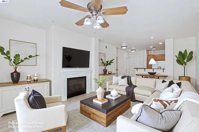 Desirable single level corner end-unit on the first floor offers a lifestyle of luxury and convenience. Large private patio perfect for entertaining and relaxation seamlessly transitions to the serene courtyard, creating a lovely indoor-outdoor living experience. 9-feet ceiling, natural light and open layout great room creates an airy and modern atmosphere. New paint and beautiful LVP flooring throughout the entire unit. Kitchen offers granite counters, maple cabinets, eat-in breakfast bar. Primary bedroom includes a walk-in closet and ensuite bathroom with a double vanity and walk-in shower. The third bedroom provides a versatile space for a home office, gym, creative studio, guest room or playroom. Central AC and heating system and ceiling fans. Washer/dryer in hallway closet. Resort style amenities include a clubhouse with gourmet kitchen, state-of-the-art gym and heated pool and spa. 24-hour secured gate entry. Assigned 2 side-by-side parking spaces in the secured underground parking lot with guest parking spaces and elevator access. Prime location near top rated schools, shopping, restaurants, golf, Kaiser, BART and 580/680. Walk to the new Emerald High School, Bray Commons Park with a fenced dog park, playground, basketball court.