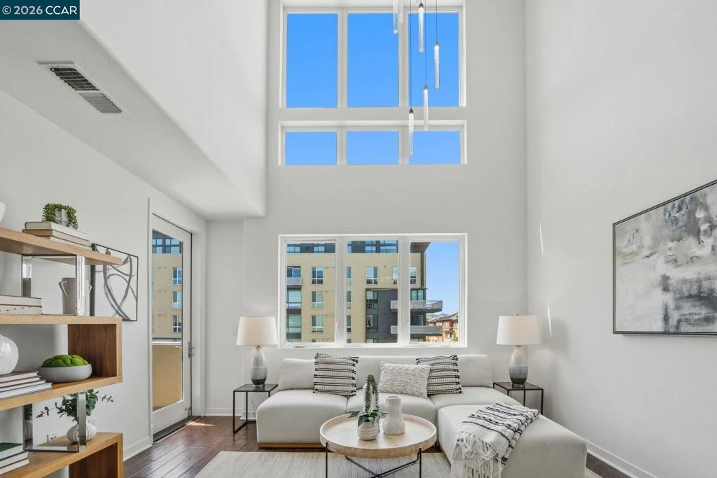 Sleek and sophisticated! Enjoy urban living in this rare, light-drenched two-level residence featuring dramatic double-height ceilings and soaring windows with stunning blue-sky views. The unique layout offers maximum privacy with one bedroom and a full bathroom on each floor, plus a versatile mezzanine loft perfect for a home office or gym. The open-concept interior boasts a chef’s kitchen with a gas stove and large peninsula, flowing seamlessly into the living area and a private balcony with East Bay Hill views. Enjoy ultimate convenience with in-unit laundry, two-car side-by-side deeded parking, and premium Homeowners Association amenities including a full gym, pool/game room, and onsite management. A true commuter’s dream, you are seconds from Dublin/Pleasanton BART, tech shuttles, and I-580/680, with Whole Foods and premier dining right around the corner.