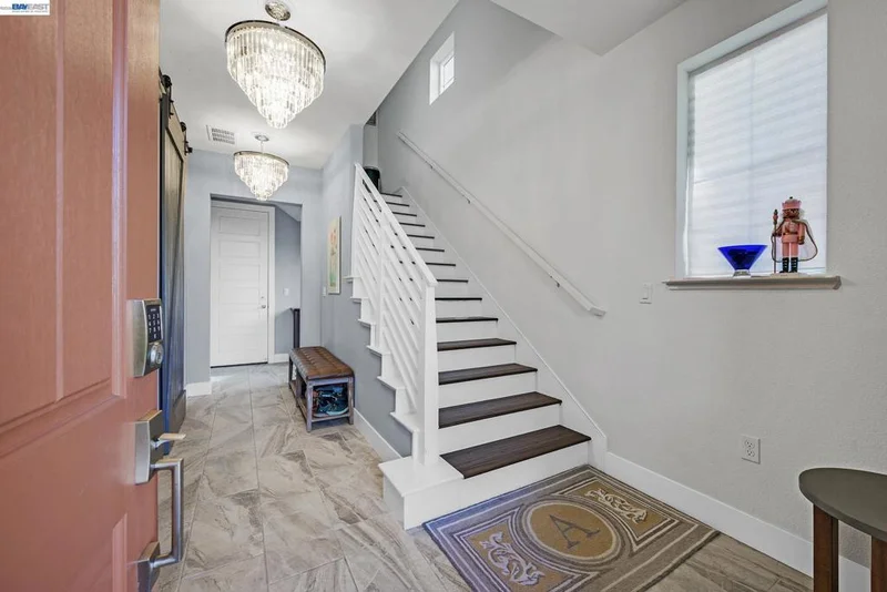 Don't miss the opportunity to live in one of Dublin's most desirable and sought after gated communities, Wallace Ranch. Suburban feel with urban amenities this 4 bedroom 3.5 bathroom home has been beautifully upgraded and welcomes you into the elegant entryway with two glittering crystal chandeliers. Gorgeous custom barn doors surround the entry to a large 2nd living room or forth bedroom/office with full bath and walk-in closet. To your right is a customized hardwood staircase leading up to the second floor with an open floor plan and casual elegance that abounds. Dark hardwood flooring a large living room with stone wall, electric fireplace, and dining space awaits you. The generous sized kitchen has been professionally and beautifully painted in a pristine white with champagne gold fixtures and has the much sought after large island and pantry. The adjoining space has room for a large dining table for entertaining or family gatherings or as displayed in the photos, pool anyone? Enjoy the view of the mountains from your second floor balcony or from the windows of the large primary suite which you will find on the third floor along with two additional bedrooms, 2 full baths, a laundry room and much more. Absolutely a must see!