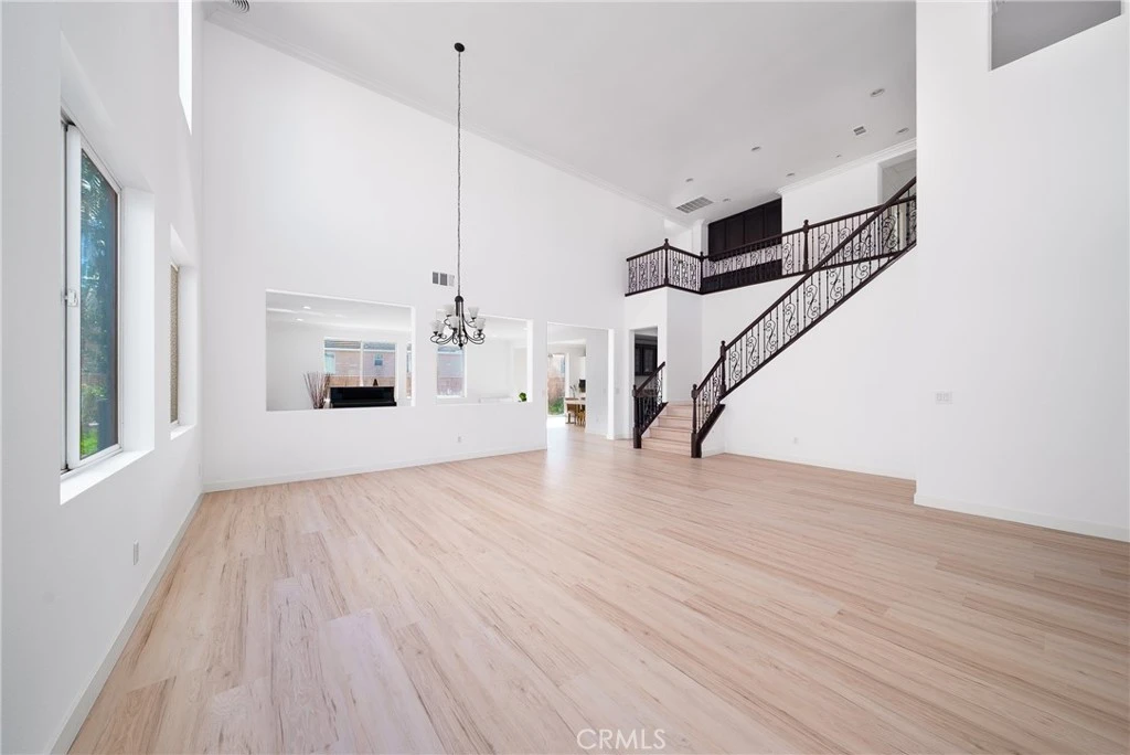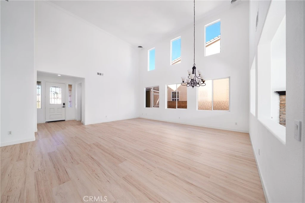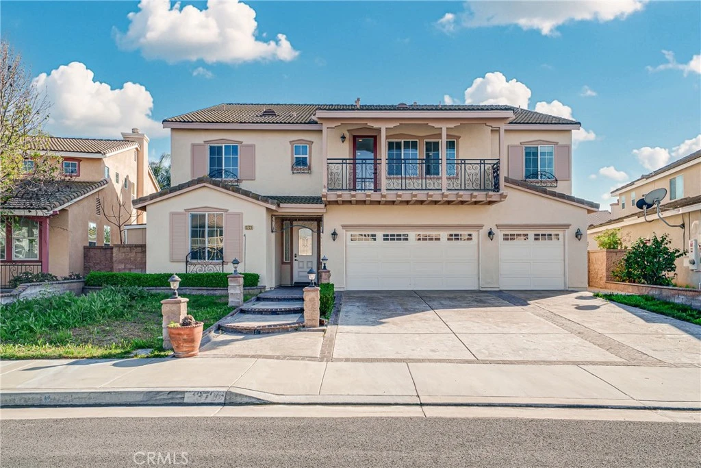 Welcome to this beautifully updated home located at the end of a quiet cul-de-sac in the desirable Citrus Ranch community of Eastvale. Featuring a north-facing balcony with scenic foothill views, this expansive residence offers 6 bedrooms and 5 bathrooms, ideal for multi-generational living. Recently renovated, the home showcases cathedral ceilings, custom iron staircase, formal living and dining rooms, crown molding, and recessed lighting throughout. The light-filled family room features a gas fireplace and flows seamlessly into the gourmet kitchen, complete with a large center island, granite countertops, designer backsplash, gas cooktop, microwave, and double ovens—perfect for entertaining. The first floor includes two bedrooms with full bathrooms, ideal for guests, extended family, or a junior primary suite, along with an interior laundry room, butler’s pantry, and direct access to the 3-car garage. Upstairs offers a spacious loft wired for home theater, opening to a balcony with elevated views. The luxurious primary suite features a fireplace, coffered ceilings, dual walk-in closets, and a spa-style bath with soaking tub, dual vanities, and separate shower. Additional bedrooms provide flexible space for home offices or guests. The low-maintenance backyard with stamped concrete is perfect for relaxing or entertaining. No HOA. Additional upgrades include Tesla solar, dual tankless water heaters, whole-house water filtration system, whole-house fan, and Nest thermostats with split A/C systems. Conveniently located near parks, schools, shopping, and major freeways.