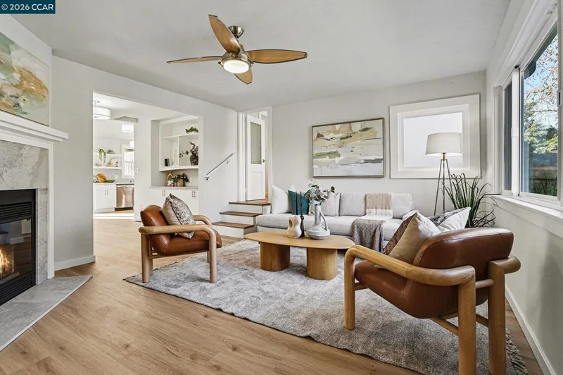 WOW! This recently renovated 3br, 2ba home on a large 7,000sf lot is a MUST SEE. Walk into the living room, with El Sobrante hills views and enjoy the corner fireplace. Up 3 stairs is your main bedroom, with ensuite and a deck overlooking the front yard with views of the El Sobrante hills. Or make it a home office (terrific if you see people at work), or a private guest suite. Back to the main level is a comfortable sitting area with large built-in that opens to the dining area and totally updated kitchen, with built-in appliances and stackable washer/dryer. Off the large main hallway are 2 large bedrooms and an adjacent updated bath. LVP flooring throughout, freshly painted inside and out, and a huge backyard. Great for play, pets, animals, or even build your own ADU. Plans are available for a 2br, 2ba ADU (included, depending on terms). One car garage, and 2 driveways make off street parking easy. Don't miss this one!