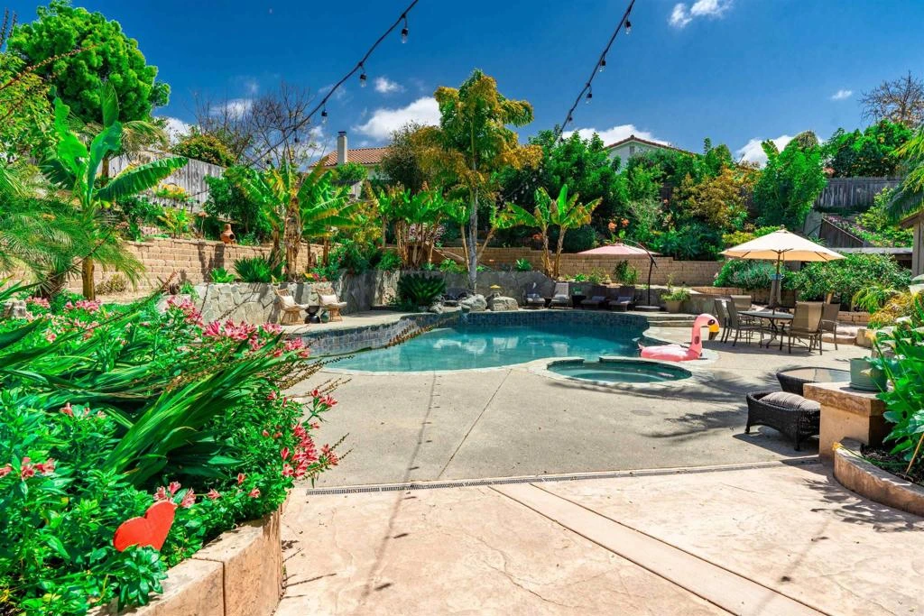 Experience the perfect blend of family living and coastal luxury in this beautifully appointed Encinitas home, ideally located just 2.3 miles from the beach. Situated on a rare 13,500 sq ft oversized lot, this 4-bedroom, 2.5-bath residence offers exceptional space, privacy, and seamless indoor-outdoor California living designed for both everyday comfort and elevated entertaining. Inside, an inviting open-concept floor plan features a formal living room that flows effortlessly into a fully equipped kitchen and dining area, ideal for family gatherings, hosting, and entertaining. Large doors open to an expansive tropical backyard oasis, creating a true extension of the living space. The resort-style backyard is designed for year-round enjoyment, featuring a large heated pool and spa, wood-burning outdoor fireplace, built-in BBQ, lush landscaping with mature citrus, avocado, guava, apple, pomegranate, apricot, plum, and banana trees and more. Multiple lounge areas for sunbathing, al fresco dining, or relaxing under the stars. A storage shed and ample parking, including a side lot for RV or boat parking, add everyday convenience. The thoughtfully designed layout includes four spacious bedrooms with generous closet space, including a desirable main-level bedroom with direct backyard and pool access. Upstairs bedrooms offer privacy and comfort, complemented by newly remodeled bathrooms, a cozy den, and a dedicated office nook perfect for remote work or study. Updated finishes throughout create a warm, comfortable, and move-in-ready environment. The home also features owned solar and newer roof. Located minutes from the beach and close to Encinitas’ top-rated schools, parks, shopping, and dining, this exceptional property offers the ultimate opportunity to enjoy the very best of the coastal family lifestyle.