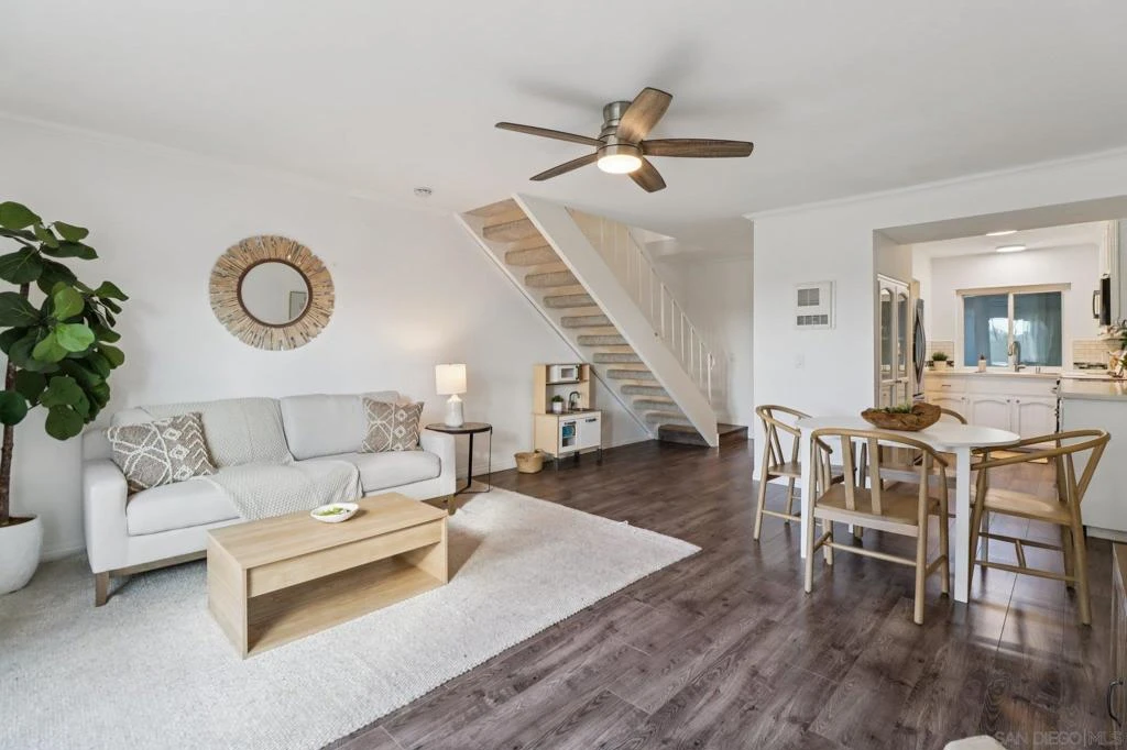 Located in the heart of Village Park, this 2-bedroom, 1.5-bath townhome offers 1,032 square feet, a one-car garage, and a layout that lives comfortably day to day. The main level features an open living and dining area with durable flooring, a refreshed kitchen with good storage, and a convenient powder room, while the upper level includes two well-proportioned bedrooms and a full bath with excellent natural light. A dedicated laundry room is located just off the garage, and a separate storage space adds functionality to the patio between the garage and entry. The home has elevated westerly exposure, bringing in warm afternoon light and spectacular sunset views (when it's not cloudy or raining), and the outdoor space is private and easy to maintain. Village Park is known for its greenbelts, walkability, and standout amenities, including a community pool with a diving board, along with tennis/pickleball courts, playgrounds, clubhouse and open park areas.