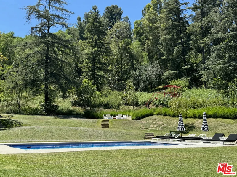 Introducing The Eden. This extraordinary, one-of-a-kind estate where refined elegance, artistic vision, and complete privacy converge in the heart of Encino's coveted Royal Oaks. Privately gated and set well back from the street, this rare 2.6+ acre sanctuary unfolds as a lush botanical retreat, surrounded by mature trees and impeccably curated gardens that create a serene, resort-like atmosphere. The residence is a masterful fusion of contemporary design and bespoke character, highlighted by striking custom Mondrian-inspired windows that bathe the interiors in natural light while framing sweeping views of the verdant, park-like grounds. Vintage 1940s Italian chandeliers cast a warm glow over the grand great room, anchored by a dramatic custom Ceppo marble fireplace mantle that exudes timeless sophistication. Designed for both everyday living and elevated entertaining, the chef's kitchen is a work of art featuring Poggenpohl custom cabinetry, a professional refrigerator and freezer, an 8-burner range with griddle, three ovens, a sculptural hammered-steel range hood, an expansive center island, and sumptuous leathered quartzite countertops. A museum-quality, fully enclosed sunroom offers the perfect setting for year-round al fresco dining. The primary suite is a private haven of understated luxury, complete with a dedicated sitting area, dual walk-in closets, and spa-like dual bathrooms. Her retreat showcases rose quartz countertops and vintage brass lighting, while his sanctuary offers an oversized steam shower and soaking tub for ultimate relaxation. Outdoors, the estate truly shines as an entertainer's paradise. The expansive grounds feature a resort-style swimmer's pool and spa, private hiking trails, a grove of mature fruit trees, a fully enclosed dog run, and an impressive cabana equipped with a BBQ kitchen, wet bar, fireplace, and outdoor shower perfect for hosting unforgettable gatherings. World-class amenities abound, including a secure safe room with ballistic door, state-of-the-art movie theater, fully equipped gym, pristine sauna and steam room, game room, 300-bottle wine storage, advanced security and sound systems, formal office, and a detached guest house with a kitchenette and a balcony overlooking a dramatic 100-foot rock-lined stream and water feature. Completing the property is a three-car garage with abundant storage and a workbench, along with extensive additional parking. Meticulously engineered with state-of-the-art retaining walls, drainage systems, and infrastructure, every element of The Eden reflects uncompromising attention to detail. More than a residence, this is a singular masterpiece testament to inspired design, exceptional craftsmanship, and a truly unparalleled lifestyle.