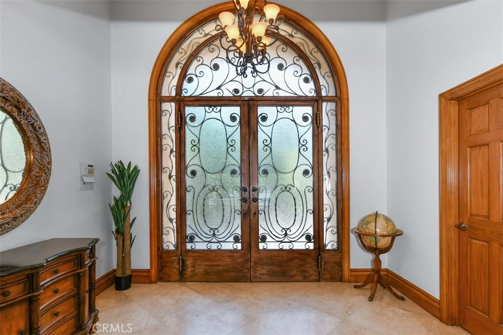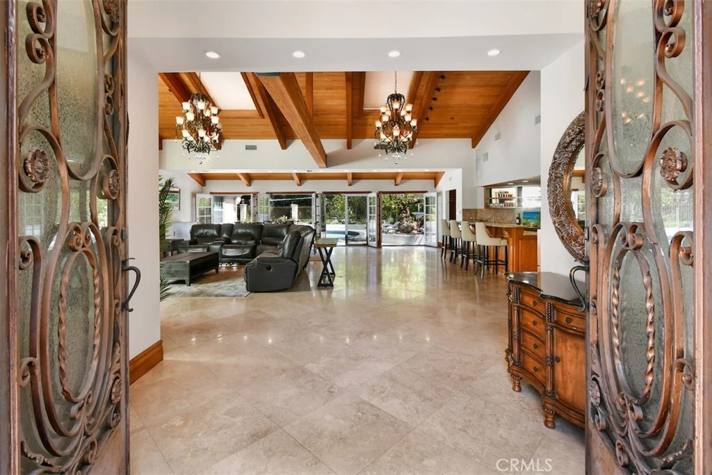 Nestled on a serene, tree-lined street, this magnificent gated estate offers a masterclass in single-level luxury, designed specifically for the sophisticated entertainer. From the moment you pass through the stately double iron doors, you are greeted by an atmosphere of grandeur, characterized by soaring vaulted ceilings, rustic wood beams, and the warm glow of dual cascading chandeliers reflected across polished stone floors. The home’s expansive living spaces flow effortlessly toward a wall of French doors and a hotel-inspired wet bar—complete with professional-grade refrigeration and an ice maker—making it easy to host gala-sized dinner parties for twenty or more. At the heart of the residence lies a true culinary sanctuary: a chef’s kitchen featuring custom cabinetry, rich granite surfaces, and a premier suite of Viking Professional and Sub-Zero appliances. The private quarters comprise four generous bedrooms, highlighted by a sumptuous primary retreat that serves as a personal sanctuary with its romantic fireplace, lounge area, and a spa-inspired bath featuring a deep jetted tub and a seamless glass massage shower. Outside, the ultra-private grounds transform into a resort-style oasis, where mature fruit trees and lush landscaping frame a sparkling pool and a built-in bbq, offering the ultimate backdrop for year-round alfresco living.