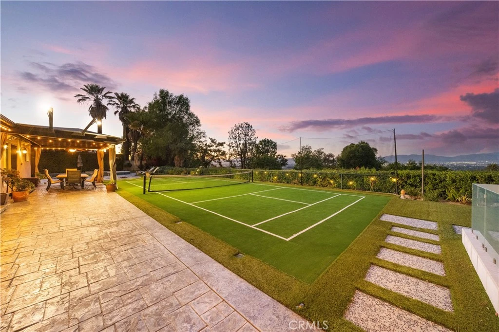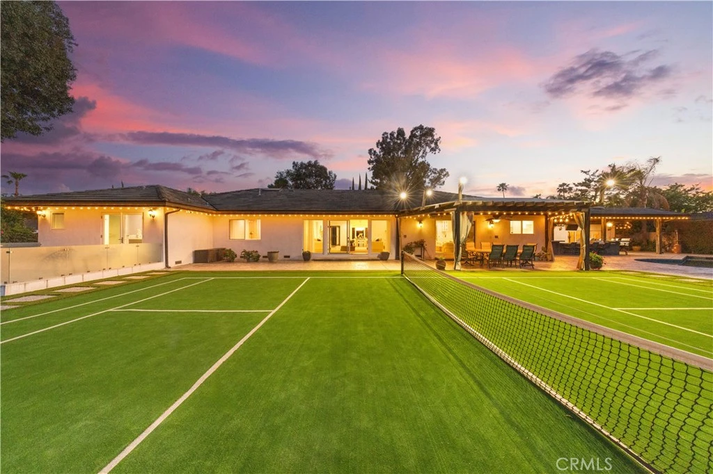 Located on a quiet cul-de-sac in the Encino Hills, this single-story residence offers 5 bedrooms and 5 bathrooms across approximately 3,775 sqft, set on an expansive flat lot of about 17,000 sqft with sweeping city and mountain views. The home features a functional single-level floor plan with main living areas at the center and separate bedroom wings for privacy. Upon entry, open sightlines extend through the living area to the backyard, enhanced by vaulted ceilings, clean lines, and expansive sliding doors that bring in natural light. The living room includes a double-sided fireplace and connects seamlessly to the dining area and kitchen. The updated kitchen features a large center island, stone countertops, and high-end appliances including a 48” Sub-Zero refrigerator, Wolf range, and Cove dishwasher. The primary suite offers direct access to a private patio, along with a remodeled spa-style bathroom and walk-in closet. A guest suite near the garage includes a dressing area and full bath, ideal for guests or extended living. Upgrades include updated plumbing and drainage, new water heater, remodeled bathrooms with Kohler fixtures, solid wood flooring in bedrooms, whole-house water filtration, Nest-controlled HVAC, upgraded network wiring, and a comprehensive security system. The backyard offers a rare flat hillside setting with panoramic valley views, a pool and spa, built-in BBQ, multiple seating areas, and a private sport court suitable for pickleball. No HOA or Mello-Roos. A rare opportunity for refined single-story living in a prime Encino Hills location.