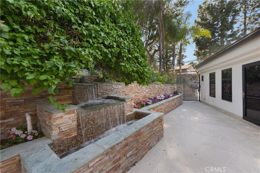 Located on a quiet cul-de-sac in the Encino Hills within the highly sought-after Lanai Road Elementary School district, this beautifully redone gated two-story contemporary residence offers extreme privacy and stunning views from every room. Enter through a security gate to a courtyard with lush greenery and fountains. The first level features a step-down living room and a spacious family room with fireplace and bar, along with a formal dining room enhanced by built-in buffets. The designer kitchen and bathrooms showcase Porcelanosa and Ann Sacks tile, Robern cabinets and backlit mirrors. The kitchen is appointed with bookmatched maple veneer lower cabinetry, white gloss upper cabinets with under-cabinet and floor lighting, quartz countertops with a waterfall edge, and glass-tiled groutless backsplash. A full suite of Miele appliances includes a refrigerator/freezer, convection oven, 5-burner range, hood, and warming drawer, along with a hot and filtered water dispenser and Rohl faucet. A breakfast nook with a built-in table and bench seating provides an inviting dining space. Hardwood and tile floors run throughout. A downstairs bedroom with a ¾ bath completes the main level. Upstairs are three bedrooms, including the luxurious primary suite featuring a fireplace, balcony, and an expansive walk-in closet with island. The spa-inspired primary bath offers an oversized shower with multiple shower heads and bench seating, plus a chromatherapy soaking tub. An upstairs laundry room adds convenience. The lushly landscaped grounds include stacked stone accents, colorful succulents, a lap pool and spa with Pebble Tec plaster, a dramatic five-level waterfall, a large Trex deck, and a barbecue area—perfect for entertaining. Additional highlights include custom lighting throughout, Fleetwood windows and doors, new glass garage doors, a newer roof, and an enclosed coyote-safe area for pets.