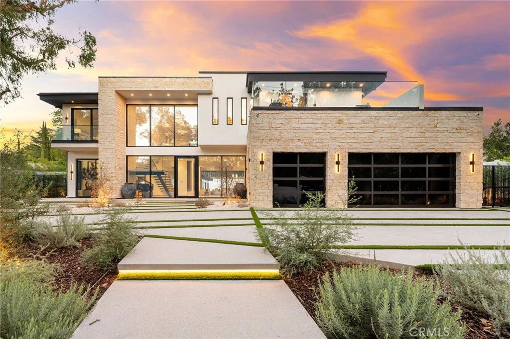 This newly built, contemporary modern masterpiece is located south of the Boulevard in Encino. The landscaped front yard and large glass entrance welcome you to a beautifully designed property featuring high ceilings and luxurious finishes throughout. The open foyer showcases a floating glass staircase alongside a formal living room and an elegant dining room, adorned with alabaster stone light fixtures. A stunning wine wall made of limestone bricks features floating glass racks. The gourmet chef's kitchen boasts Taj Mahal quartzite slabs, dual center islands, a breakfast table, stainless steel appliances, designer lighting, and a walk-in pantry. The inviting living room is highlighted by travertine wood slabs, a brushed walnut veneer surrounding an ethanol fireplace, and a wall of pocket sliding glass doors that lead to an expansive entertainer's backyard. On the first floor, you'll also find a state-of-the-art media room, a second primary suite, a secondary laundry room, and a pet wash station. Upstairs, the romantic master suite offers a large fireplace, private balcony, dual walk-in closets with LED-lined cabinetry, and a spa-like bathroom with Travertine detailing, a soaking tub, and a massive glass steam shower. Each spacious guest bedroom includes its own private balcony and luxurious bathroom, perfect for accommodating family and friends. Outside, the entertainer’s yard features a sparkling pool and spa, BBQ center, fire pit, sports courts, a putting green, and an ADU complete with 2 rooms, kitchen, and full bath. Additional features include a smart home system, enhanced security, and BricksSmart-glass Technology Windows & Doors. This stunning home offers a perfect blend of modern luxury and convenience, located near upscale shopping, fine dining, and more.