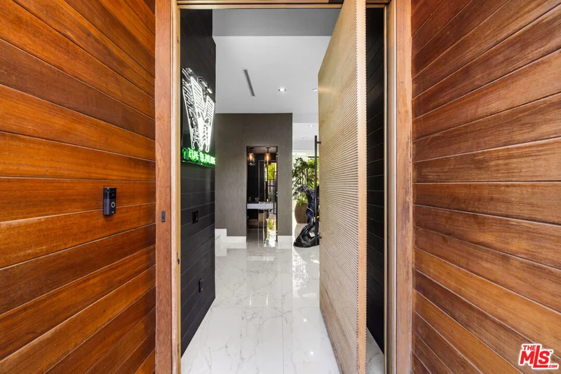 Set behind 10 feet private gates in prime Encino, this bold contemporary estate is designed for those who value space, privacy, and a true entertainer's layout. With three bedrooms all located upstairs and two professional music studios, one downstairs and one upstairs, the home offers a rare blend of creative functionality and modern design. Inside, soaring ceilings and dramatic floor to ceiling shatterproof glass create an immediate sense of scale and light. White oak floors run throughout the open concept layout, connecting the main living areas with effortless flow. The design is clean and striking, yet warm and inviting, ideal for both everyday living and hosting on any scale. The kitchen commands attention with an oversized Calacatta quartz island, custom cabinetry, and appliances, all opening directly to expansive living and dining spaces that overlook the backyard. A statement wood staircase with integrated step lighting leads upstairs, where all four bedrooms are thoughtfully positioned for privacy. The primary suite is both spacious and refined, featuring double door entry, a private balcony, two custom walk in closets, and a spa style bath with a freestanding soaking tub and sleek, modern finishes. The backyard is built for enjoyment, featuring a pool, spa, water feature, generous lawn, BBQ area, and multiple seating and entertaining zones enhanced by full surround sound. Whether hosting large gatherings or enjoying a quiet evening, the outdoor space delivers versatility and impact. With paid off solar, advanced security, gated parking, a two car garage with direct access, basketball half court, EV charger, and ample storage, this home checks every box. Contemporary, private, and thoughtfully designed, this Encino property stands out for its scale, creativity, and lifestyle appeal.