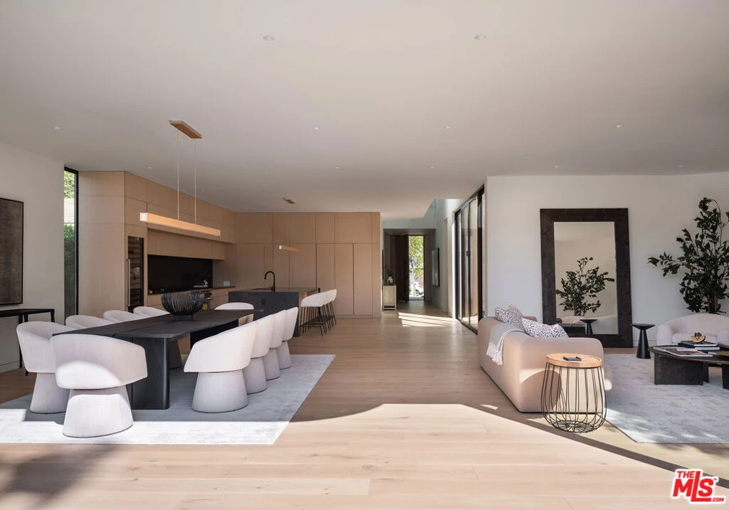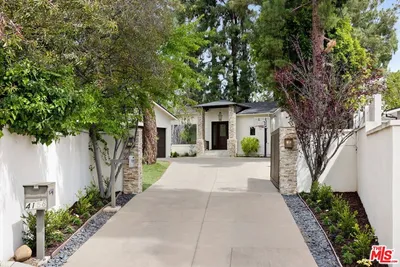 Enter an environment where the warmth of organic modern architecture meets stunning new luxury construction. Elegant 6BR + 5.5BA property sits on an almost 11,000 sqft lot + includes a 1BR + 1BA guest house w/its own address. Gorgeous open floor plan features sleek kitchen w/center island, quartz counters, white oak cabinets + stainless steel appliances including a Wolf 8 burner range w/double oven. Living room w/fireplace has huge sliders leading out to the extensive grassy grounds. Kitchen overlooks a private deck area w/Japanese landscaping. Both the kitchen + dining area have custom designed light fixtures. The gentle curves of the home's exterior can be found in details throughout the house, such as the fireplace, the curved corners of rooms + even the concrete steps throughout the exterior. The opulent primary suite has everything. Huge floor to ceiling windows slide open for viewing the amazing grounds. A separate area for lounging opens to a spacious side balcony. Two custom walk-in closets have extensive built-ins. Gorgeous primary bath w/soaking tub has an oversized shower w/dual rain heads + seating benches, plus double sinks + vanity area. Second level includes a sitting area/library w/dramatic skylight + 2 more ensuite BR's. An airy floating staircase connects the two levels, w/another 2BR + 2BA below. The grand living space is accentuated w/high ceilings, extensive use of glass + is infused w/a spectacular amount of natural light. Step outside + encounter the exceptional park-like oasis. An immense pool w/spacious baja shelf also includes a spa. Amazing outdoor entertaining area features stainless steel BBQ, a smoker, a refrigerator, a pizza oven, stainless steel sink + tons of cabinets. At the back of the private grounds sits the jewel of the property - a 1BR + 1BA ADU with 800 sqft that looks like a mini version of the main house, w/the same unique wood exterior + curves inside + out. The floor plan includes an extensive kitchen w/quartz center island + living room. It would make a great office or a multi-generational compound. The living space sliders completely open to the patio creating a perfect indoor outdoor flow. Its view looking out over the grounds + backside of the main house creates a dramatic backdrop for everyday living. This is a one of a kind property. Come satisfy your appetite for something new + break away from all the "modern farmhouse" + "modern box" replicants. And experience over 6,100 sqft of new architectural luxury.