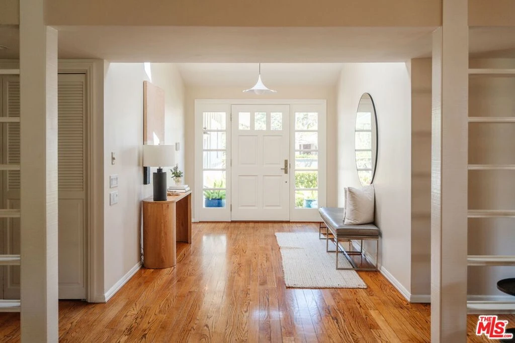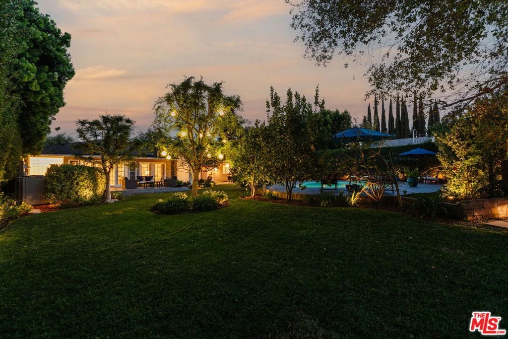 Located on a quiet cul-de-sac in prestigious Amestoy Estates, this meticulously maintained single-story Encino residence sits on a lush 16,552 sq ft lot and offers 6 bedrooms, 5 bathrooms, and nearly 4,300 sq ft of bright, airy living space with seamless indoor-outdoor flow. Mature landscaping and abundant greenery create a serene, private setting. The beautifully appointed kitchen features custom Woodmode cabinetry and premium appliances including a Wolf sealed gas range top, Sub-Zero refrigerator, double Miele ovens with warming drawer, two Miele dishwashers, two sinks, and a U-Line beverage center. A charming breakfast nook opens to the home's living, dining, and media spaces filled with natural light. Additional highlights include a movie projector with drop-down screen and hidden media storage. Plus, a new three-zone security system with exterior beams. The primary suite offers a tranquil retreat with French doors opening directly to the outdoor spa. The newly renovated primary bath features elegant tilework, dual sinks, and a soaking tub. Solid wood floors, generously sized bedrooms, ample closets, and abundant built-in storage enhance comfort and functionality throughout the home. A bonus bedroom with soaring beamed ceilings and en-suite bath is ideal for guests, a home office, or creative studio. Designed for relaxation and entertaining, the expansive backyard features a pool, spa, fruit trees, lush landscaping, and solar panels for added efficiency. Gated in one of Encino's most sought-after neighborhoods, this turn-key property offers comfort, scale, and timeless appeal.