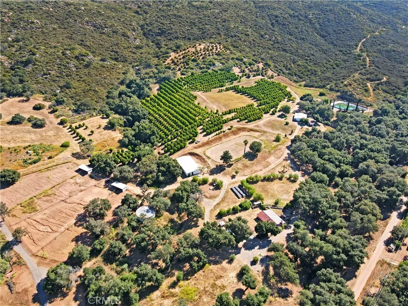 33-acre horse and agricultural ranch in the hills of Escondido with two adobe homes (2 bedroom, 1 bath and 1 bedroom, 1 bath guest house) with their own carved out backyard, a 1 bedroom, 1 bath house, a 3 bedroom, 1 bath manufactured home, and a spacious workshop to store any equipment or vehicles needed to maintain the ranch. The property also has a 2-horse stall, a 12-stall barn, an indoor horse riding carousel, and a large horse riding area. In addition, there's a private well on the ranch powered by solar panels and a large reservoir. There's 5 acres of Valencia oranges and 3 acres of Haas avocados with gravity fed irrigation. Get out of the city and enjoy this beautiful ranch with all its features, especially the views from the top of the property overlooking a lake and other mountains.