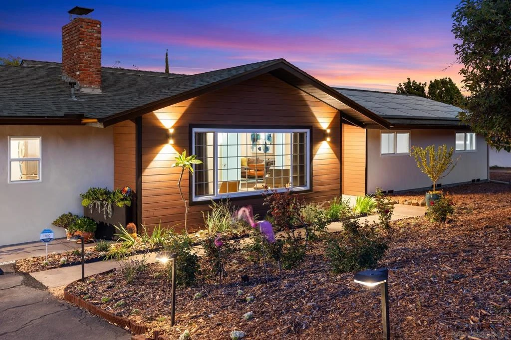 Stunning midcentury masterpiece, thoughtfully designed and set on a 1/2 acre lot with sweeping east-facing views. California indoor-outdoor living at its finest with this remodeled 5-bedroom, 3.5 bath estate. The main home features 4 bedrooms, 2.5 baths and a pool—and there’s nothing “junior” about the attached Junior ADU, a 1-bedroom/1-bathroom unit with a separate entrance and a full kitchen, offering the ultimate in flexible multi-generational living or potential for passive income. At the heart of this home is a chef's kitchen that will stop you in your tracks. Light oak cabinetry, cream-color quartz countertops with a waterfall edge, and a dramatic seafoam blue ceramic tile backsplash set the stage, while premium appliances—including an induction range—make cooking a genuine pleasure. An expansive peninsula with wine storage and barstools anchors the open-concept space, flowing naturally into the dining area and family room, an effortless setting for everything from casual mornings to memorable dinner parties. The Junior ADU (JADU) is nothing short of exceptional, from its rich mahogany pocket doors to its private patio and a complement of full-size appliances. Thoughtfully designed to maximize the space, this relaxing retreat offers its own full kitchen that includes an induction range and quartz countertops; a grasscloth-accented bedroom that opens to a private, gated patio; and an elegantly arranged bathroom with teak and marble accents, a huge spa-style shower, and a full-size LG WashTower wash/dryer. The JADU has earned a coveted spot in the Top 1% of Airbnb listings, having attained “Guest Favorite” status and consistently maintaining an impressive occupancy rate—a testament to its quality, design and guest appeal. Whether you continue to use it as a high-performing Airbnb mid-term rental, transition to a long-term tenant, or welcome extended family, the income potential here is as impressive as the space itself. Meander outside and discover a backyard with mountain views that rivals any resort. The lushly landscaped area surrounding the pool and patio offers a rare sense of seclusion, perfect for afternoon swims, al fresco dining, and unforgettable evenings under the Southern California sky. Mature fruit and nut trees create a setting that is as beautiful as it is functional. With a half-acre lot providing ample space, there is exciting potential to add a second ADU, further maximizing long-term value and versatility in one of California's most in-demand housing markets. A single-story layout spanning four bedrooms and 2.5 baths, the main residence blends midcentury charm with a mix of original vintage character and modern updates at every turn. Water-resistant wood-based laminate flooring throughout offers warmth and beauty plus everyday durability. The formal living room welcomes you with built-in bookshelves and a classic brick fireplace. The adjacent great room features east-facing mountain views and sliding glass doors that keep the interior light and bright and connect to the pool area and landscape beyond. A dedicated laundry room/butler’s pantry with butcher block herringbone counter and exposed brick adds convenience with character. An adjacent powder room—on the other side of a mahogany pocket door—features a solid teakwood vanity with Carrara marble top, and retro tile flooring. Leased solar keeps energy costs in check, city water and sewer lines add convenience, and the prime Escondido location puts you minutes from the charm of historic downtown, North County's wine country, scenic hiking trails, and easy freeway access to the greater San Diego metro area. Five bedrooms total. Two distinct living spaces. One extraordinary property.