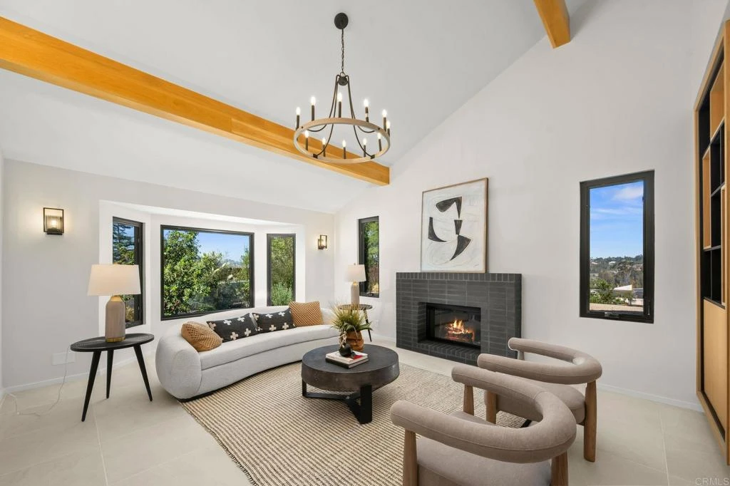 Experience elevated living at 806 Needlerock Place, a sophisticated luxury residence in desirable Escondido in the hills above Bear Valley. This 4-bedroom, 3-bath home has been completely transformed through an extensive remodel where every surface was touched, delivering a bright, move-in-ready sanctuary that has never been lived in since completion. Featuring custom cabinetry and white oak woodwork, quartz countertops, black-framed windows and doors, and seamless indoor-outdoor flow, the open-concept spaces are flooded with natural light and framed by panoramic views over Southwest Escondido. The gourmet kitchen opens to dining and living areas that effortlessly connect to the outdoors. The primary suite offers serene views, a spa-like bath with dual vanities and a luxurious walk-in shower, plus a custom closet. Unwind in the private cedar sauna for ultimate wellness. Additional highlights include a dramatic two-story open stairwell with glass railing, a built-in media wall, and abundant storage throughout. Outside, enjoy resort-style grounds at the end of a quiet cul-de-sac on 1.42 private acres. New hardscape, mature low-maintenance landscaping, fire pit seating, a covered patio with wood slat privacy screen, and a soothing water feature create the perfect setting for entertaining or relaxation. Owned solar panels on the new roof deliver energy efficiency and significant monthly savings. This rare, truly custom high-end offering combines privacy, bespoke architectural details, panoramic views, and turnkey luxury in a market where such meticulously updated properties on acreage are scarce.