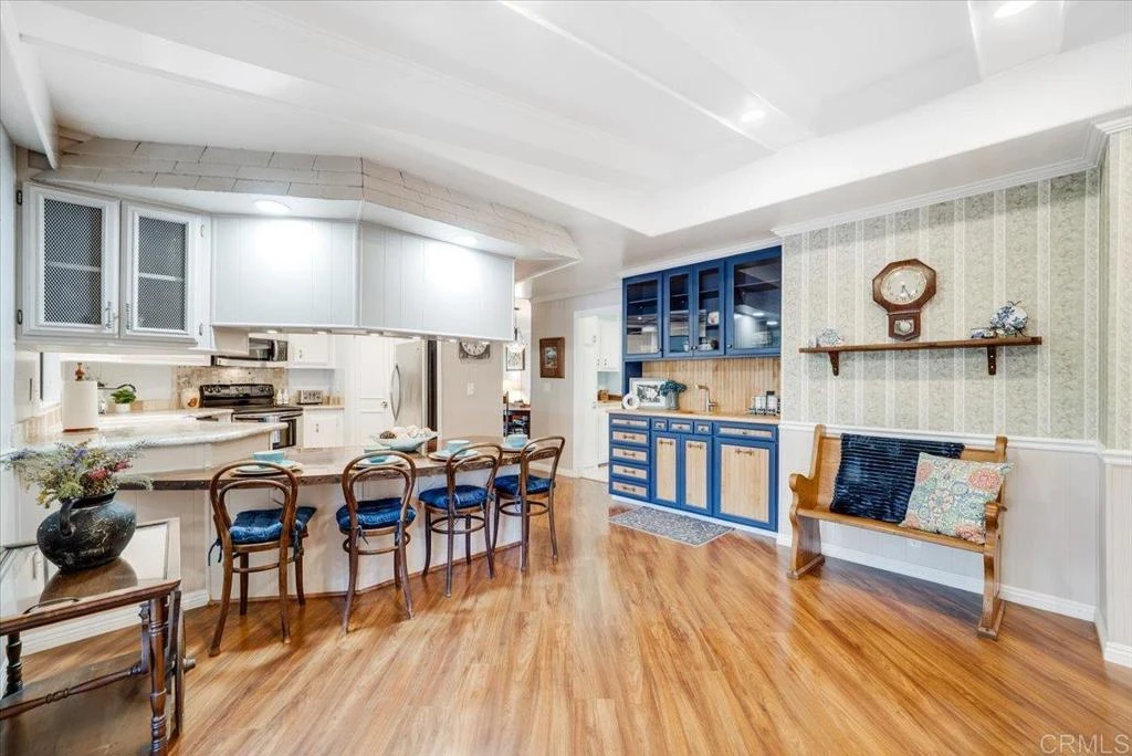 Extensively upgraded throughout, this beautiful land-owned home is located in the peaceful 55+ Champagne Village community, near Lawrence Welk Resort and Golf Course. Set toward the upper portion of the community, the home enjoys a quiet position away from through traffic and a private, natural backdrop. The interior features upgraded flooring, crown moulding, and abundant natural light throughout. Large multi-pane windows in the living room frame leafy views and create a bright, welcoming atmosphere. The upgraded kitchen offers modern finishes, stainless steel appliances, and a handcrafted island well-suited for gatherings, flowing naturally into the main living areas. Both bedrooms feature en suite bathrooms. The primary suite bathroom is thoughtfully upgraded with dual vanities, extensive cabinetry, upgraded countertops, and a glass-enclosed walk-in shower with custom tile work, complemented by recessed lighting and modern fixtures. Outdoor living is enhanced by a spacious covered patio and a peaceful rear yard with mature landscaping, offering a private setting for relaxing or enjoying the surrounding greenery. Additional features include central heating and air conditioning, a leased solar system, and well-proportioned living spaces designed for comfort and functionality. Community amenities include a pool, jacuzzi, fitness room, bocce ball, putting green, tennis courts, pickleball courts, private gated entrance, billiards room, dog park, and RV storage.