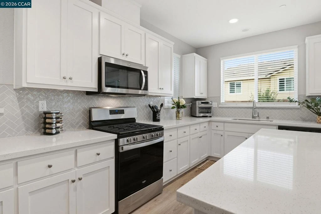 An exceptional opportunity to own the highly sought-after Barton Model on a premier corner lot, surrounded by rolling hills, top-rated schools, shopping, dining & convenient access to Napa Valley. This newer home blends contemporary design with thoughtful builder upgrades throughout. The light-filled, open layout flows seamlessly from the living room to the family room, dining area & kitchen, showcasing luxury vinyl plank flooring, quartz countertops, tile backsplash, fireplace, powder room & laundry room. The fully finished, turnkey backyard retreat features an adjustable louvered patio cover with solar lighting, concrete walkways & mature trees ideal for entertaining, unwinding, or enjoying California evenings outdoors. Energy-efficient & tech-forward highlights include 10 owned solar panels with bird-proofing, a tankless water heater, EV-charger-ready plumbing, a hardwired security system, custom automatic window screen & more. The spacious primary suite offers a serene escape with a walk-in closet, marble soaking tub, dual vanities & a beautifully coordinated walk-in shower. A versatile loft plus three additional bedrooms provide flexibility for guests or multigenerational living. Meticulously maintained & ideally positioned, this home delivers comfort, style & lasting value.