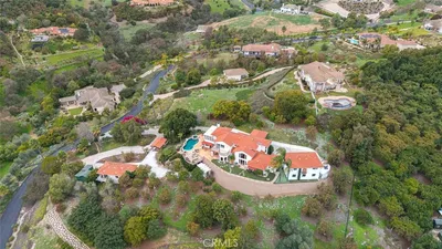 Step into serenity with this custom-built 6,200 SF estate on 3.4 acres in coveted Rolling Hills Estates. Meticulously maintained and landscaped with rose gardens, fountain, koi pond, gazebo, fruit trees and fenced grounds — plenty of room for a barn and corrals with community riding trails adjacent. Paid solar and an irrigation well help keep operating costs low. All principal living is on the main level: 5 bedrooms, 5.5 baths, family room, living room and chef’s kitchen with Viking refrigerator, La Cornue range, Danish copper hood, Bosch dishwasher, limestone floors and built-in wet bar. Soaring wood-beamed ceilings, skylights, wood-inlay and walnut flooring, two dining rooms, two multi-use rooms and a large downstairs recreation area with potential guest-house use. Outdoor kitchen patio features a stone fireplace, wood pizza oven and built-in Viking grill. Primary retreat offers vaulted ceilings, fireplace, built-in coffee/bar, expansive closets and spa-like bath with soaking tub, accent fireplace and walk-in shower. Recent HVAC and septic replacements, full security/camera system, high-end custom finishes throughout. Community amenities include 24-hour guard gate, tennis/pickleball courts, ponds, clubhouse and equestrian facilities. Ready to enjoy country-living with luxury finishes.