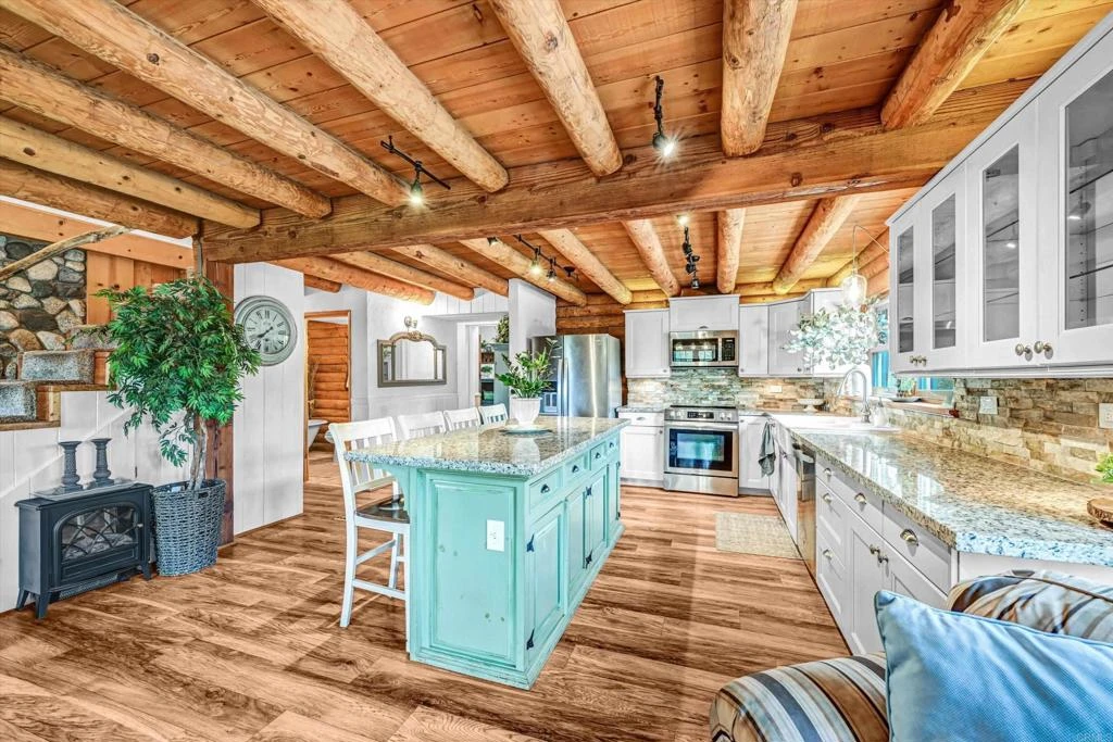 Escape to your own private retreat with this beautifully updated log home in Fallbrook. Spanning 2,445+ sq. ft., this secluded property offers a serene, mountain-lodge ambiance. The home features 3 bedrooms and 2 bathrooms with a versatile downstairs optional 4th bedroom or office. The open-concept layout centers around a welcoming family kitchen, perfect for gathering. Step outside to enjoy the scenic grounds complete with a pool, covered patio, numerous producing fruit trees, and sports court-ideal for entertaining or relaxing. Large covered patio creates a versatile outdoor living area, perfect for entertaining, dining or enjoying peaceful mornings and evenings. The detached two-car garage features a second story enclosed loft, with full bathroom, currently utilized for guests. Solar is leased currently for $162 per month with a 1.9% annual increase.