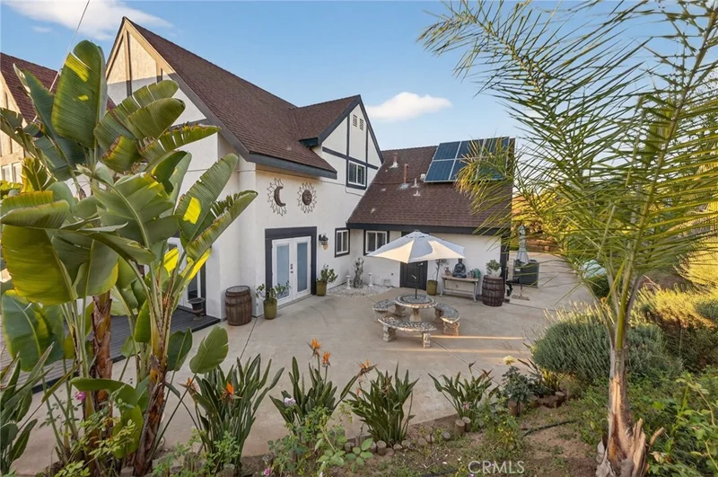 Welcome to your own private botanical retreat in the heart of Fallbrook. Situated on approximately one acre behind a gated entrance with a long, private driveway, this stunning two-story Modern Country-inspired farmhouse offers panoramic views, usable land, paid solar, and a peaceful setting that feels worlds away — yet close to everything. As you arrive, you’re welcomed through a private front courtyard anchored by a resort-style grand fountain, creating an unforgettable first impression and setting the tone for this tranquil estate. The grounds are truly special. Mature landscaping creates a botanical garden ambiance with room to expand, add a pool, or design your dream outdoor entertaining space. Animal corrals, RV parking, and a detached shed equipped with electricity and A/C provide flexibility for a workshop, studio, gym, or additional storage. Inside, expansive beamed ceilings, rich wood flooring, and an abundance of natural light define the main living areas. The dramatic living room features soaring ceilings and walls of windows that frame the surrounding greenery and hillside views. The updated kitchen offers granite countertops, stainless steel appliances, and generous prep space, seamlessly connecting to the living areas for effortless entertaining. The downstairs primary suite provides privacy and convenience with a spacious layout and walk-in closet. Upstairs, you’ll find two additional bedrooms connected by a Jack-and-Jill bathroom, plus an approximately 300 sq ft bonus room (not included in square footage), ideal for a fourth bedroom, office, media room, or playroom. The expansive view deck invites you to enjoy sunsets, morning coffee, and the serenity that defines Fallbrook living. Modern farmhouse character. Private courtyard entrance. Resort-style arrival. Paid solar. Usable land. Endless opportunity.
