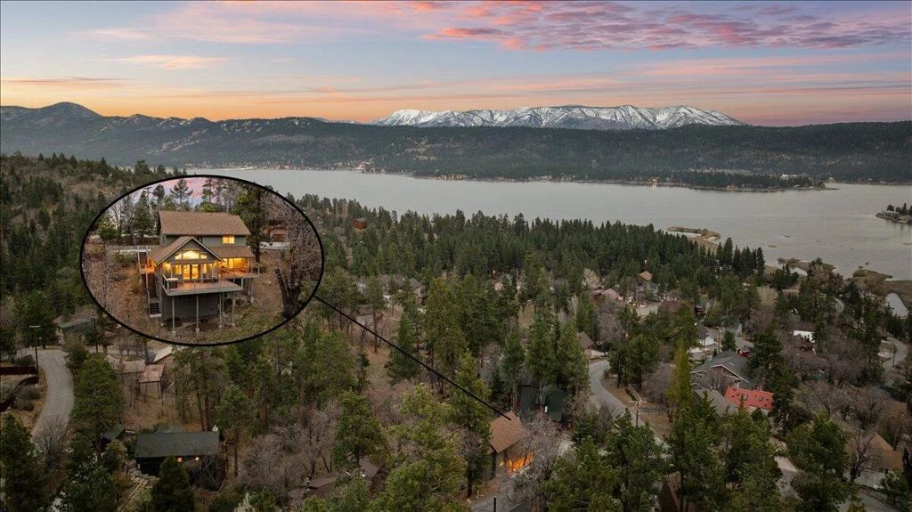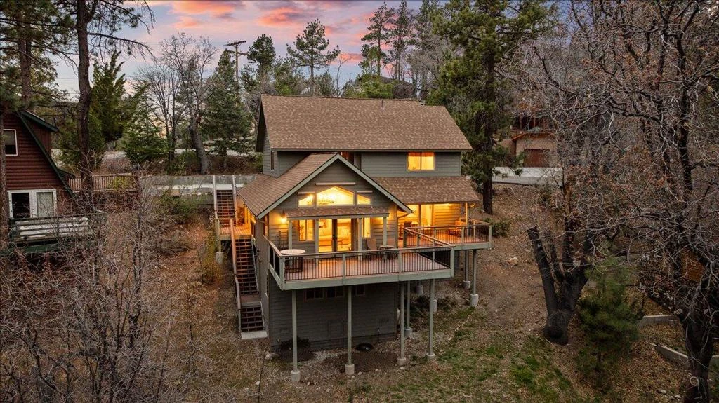 Stunning Mountain Retreat with Panoramic Forest and Lake Views in Fawnskin, CA Nestled in the heart of the San Bernardino Mountains, this gorgeous 2019-built home offers breathtaking mountain and lake views that will captivate you from the moment you arrive. Wake up to spectacular sunrises over the water and enjoy mesmerizing star-filled night skies that only a mountain setting can provide. The rear of the home features an expansive Trex deck with elegant wrought iron railings, perfectly positioned for enjoying your morning coffee while taking in the lake views. Surrounded by lush national forest, this private oasis feels like a true escape yet is conveniently located in desirable Fawnskin. Inside, the home shows like new with premium finishes throughout. Karndeen flooring flows seamlessly through the open living spaces, complemented by vaulted beamed ceilings and abundant windows that flood the home with natural light. Custom lighting, dual-pane windows, and Louisiana Pacific Smart Side exterior siding highlight the quality construction. The chef's kitchen boasts custom granite counters and backsplash, paired with upscale appliances and custom fixtures. Three large master suites, each with its own bathroom featuring custom fixtures, provide ultimate comfort and privacy for family or guests. Additional highlights include a heated concrete driveway, rain gutters, and an awesome back deck that's ideal for entertaining or simply relaxing amid the beauty of the mountains. Brand new furnace and tankless water heater. The build up has been finished to be livable with it's own bathroom. Approximately 400 additional space of living area. Bringing the square footage up to over 2,400. This turnkey mountain home is ready for you to create lastingmemories in one of Big Bear's most scenic areas.