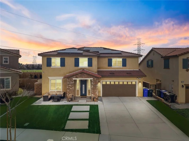 Welcome to this beautifully upgraded 5-bedroom, 3-bathroom home, built in 2022 by D.R. Horton, located in a highly desirable gated community in North Fontana. Situated on a generous-sized front-row lot, this home offers rare privacy and sweeping mountain views, with no homes directly behind. This gorgeous two-story residence features a bright, open layout with spacious living areas designed for both comfort and entertaining. The low-maintenance turf front yard provides excellent curb appeal, while the backyard is thoughtfully enhanced with a built-in shed and premium energy-efficient upgrades. Enjoy modern sustainability with two Tesla batteries, a Tesla charger, and two separate solar systems. One leased and an additional solar pack available with additional charge, which can be disconnected if not desired. Perfectly located just minutes from shopping, dining, and entertainment, with easy access to the 15 and 210 freeways, this home offers the ideal balance of convenience, privacy, and modern living. Low HOA, Only $68 a month! Move-in ready, beautifully maintained, and priced to sell—this is a must-see home you won’t want to miss.