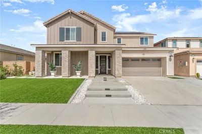 Discover contemporary elegance in this stunning 2023-built home, perfectly situated in the gated Arboretum community. Boasting 3,271 sq. ft. of meticulously designed living space, this turnkey residence features 5 spacious bedrooms and 4 full bathrooms, including a convenient downstairs bedroom and full bath ideal for guests. Every bedroom offers a walk-in closet for maximum storage. Move-in ready with freshly cleaned carpets and a professional deep clean, this home also features fully PAID-OFF solar panels! The gourmet kitchen is a chef’s dream, featuring quartz countertops, a double oven, and ample cabinet space, perfect for entertaining or family meals. Set on a 6,100 sq. ft. lot, the exterior has been transformed into a low-maintenance oasis with professional landscaping, artificial turf in the front and back yards, tiered retaining walls, and an abundance of fruit trees including passion fruit, apricot, plum, peach, guava, pomegranate, and more. Life in the Arboretum community means enjoying a variety of resort-inspired amenities just steps from your door. Residents have access to a sparkling community pool, a fully equipped fitness center, tennis and basketball courts, a playground, a dog park, and a beautifully designed clubhouse—all set within the privacy of a gated neighborhood. Golf lovers will appreciate the close proximity to Sierra Lakes Golf Club. Daily conveniences are just minutes away at Arboretum Marketplace and Sierra Lakes Shopping Center, home to popular retailers like Costco, Home Depot, and Ralphs, along with a wide range of restaurants. For even more shopping and entertainment, both Ontario Mills and Victoria Gardens are just a short drive away. Close access to the 210 freeway makes commuting simple, this home is a must see!